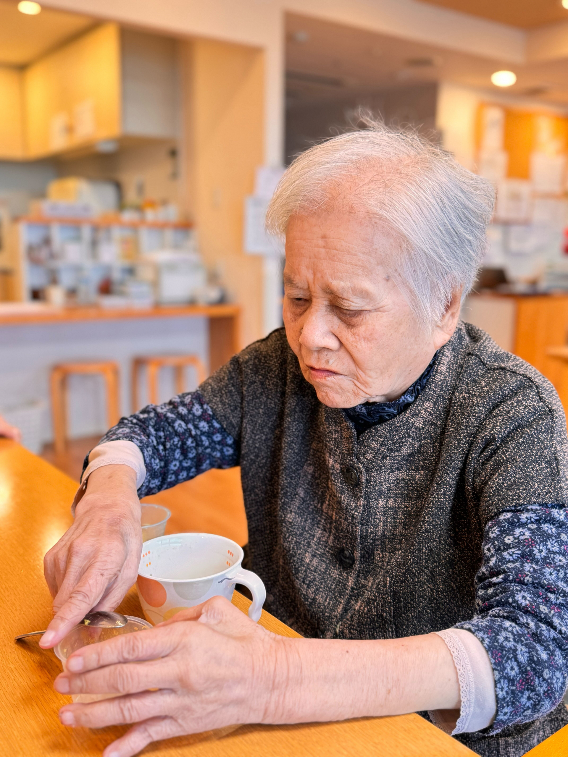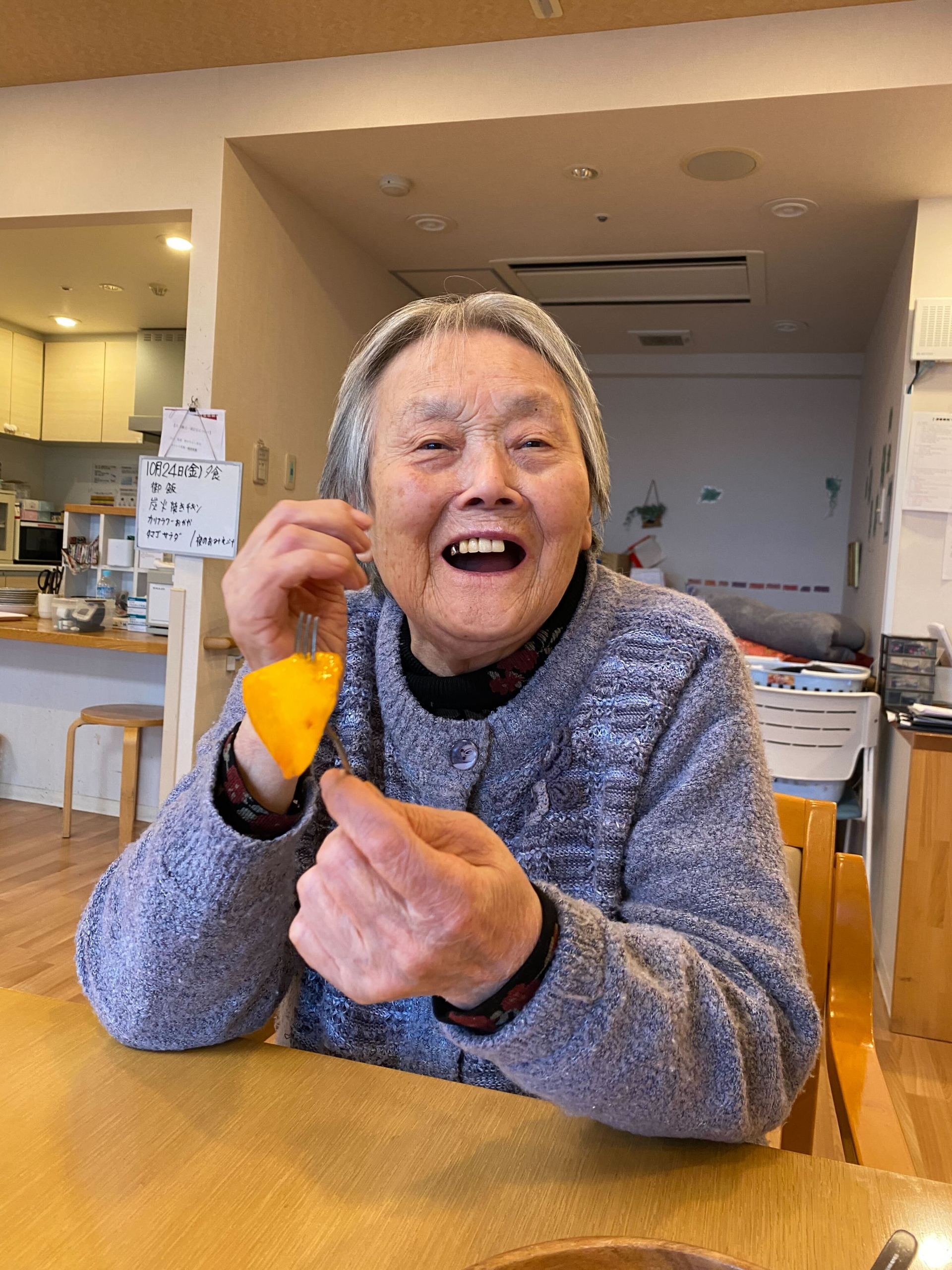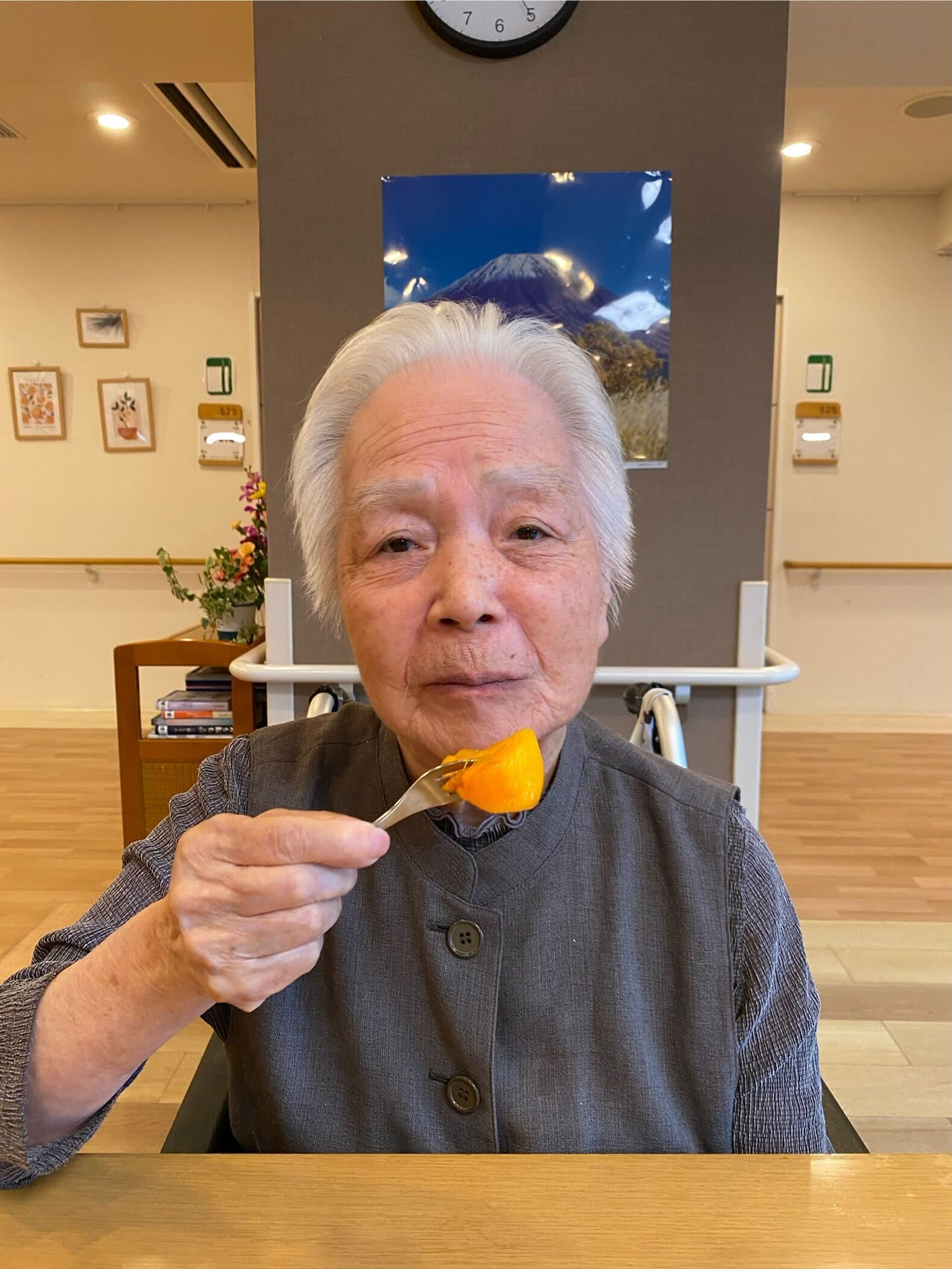 ユニットでは、甘くてとろける柿と温かい飲み物を囲んで、ほっと一息。あっという間に全部召し上がりました。「おいしいね」「昔よく食べたね」と笑顔が広がり、会話も弾みました。秋の味覚を楽しみながら、皆さんの表情もとても柔らかく、心までぽかぽかに。季節を感じる、あたたかな午後のひとときとなりました。
