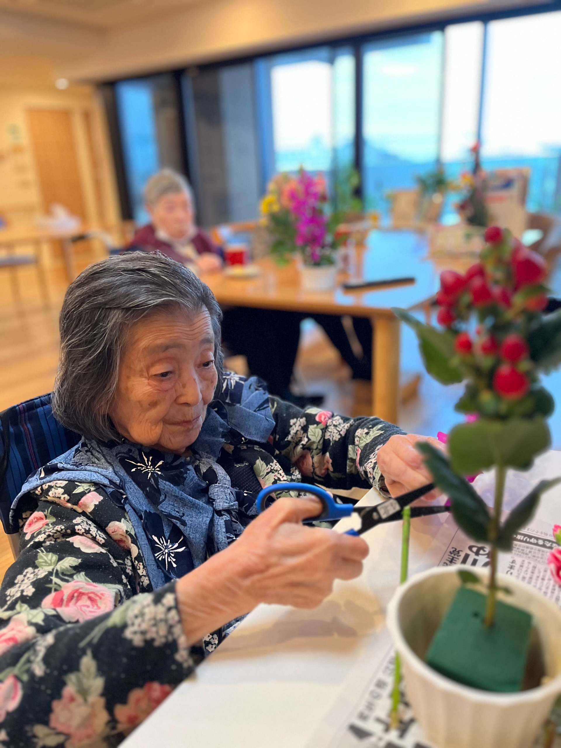 先日、皆様が1階へフラワーアレンジメントを参加に行きました(^^♪