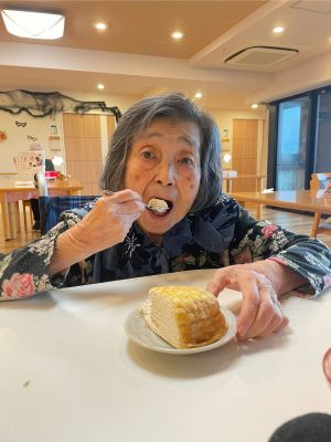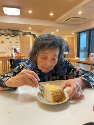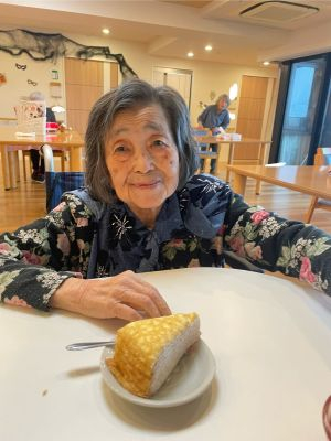 ご家族からいただいたケーキを提供し、説明すると、「あら、本当~」「うれしい、食べる」と。