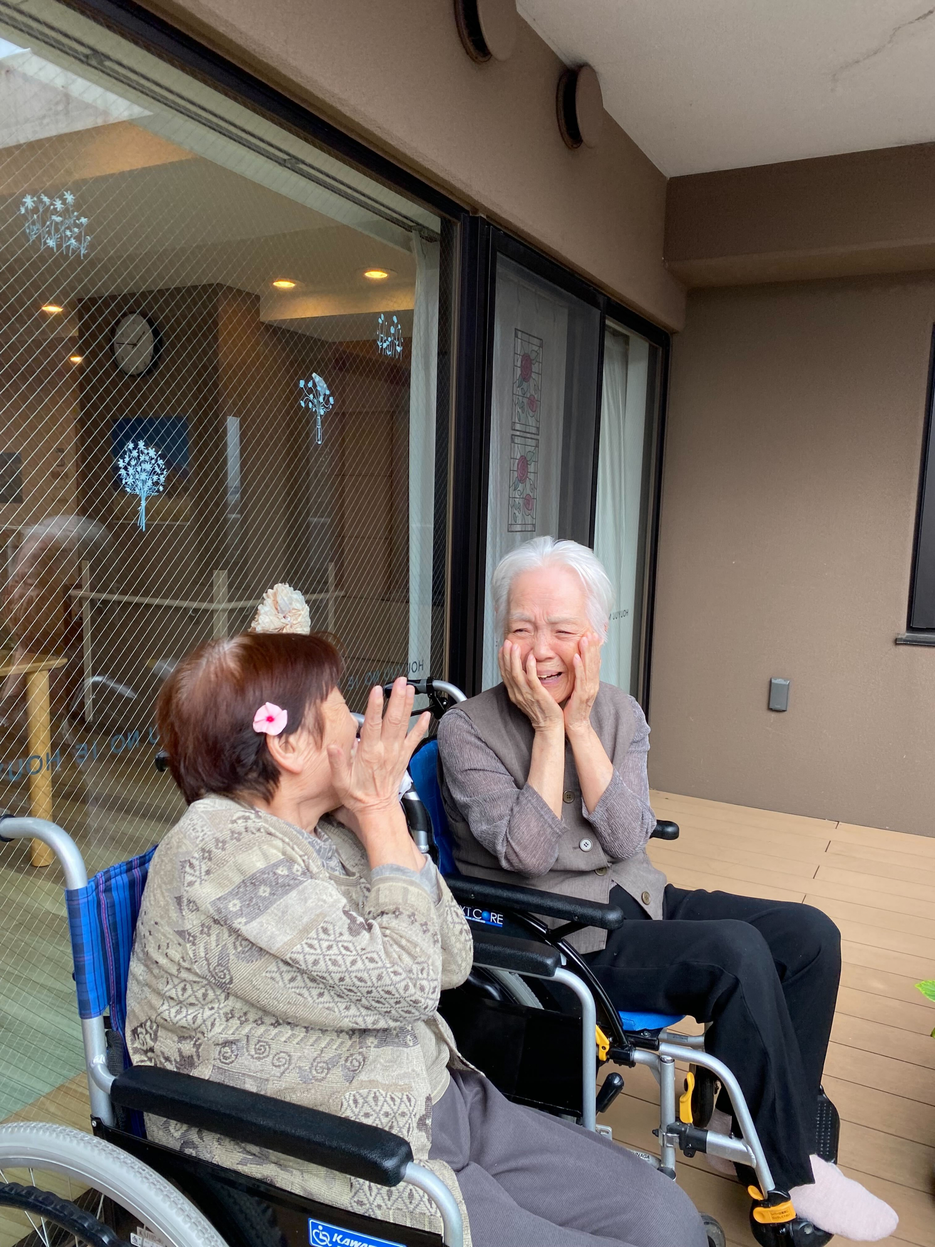 秋風にそよぐ髪と花飾り 心まで軽やかにベランダでのんびりと過ごす午後。秋の空気を感じながら、自然と会話も弾みます。