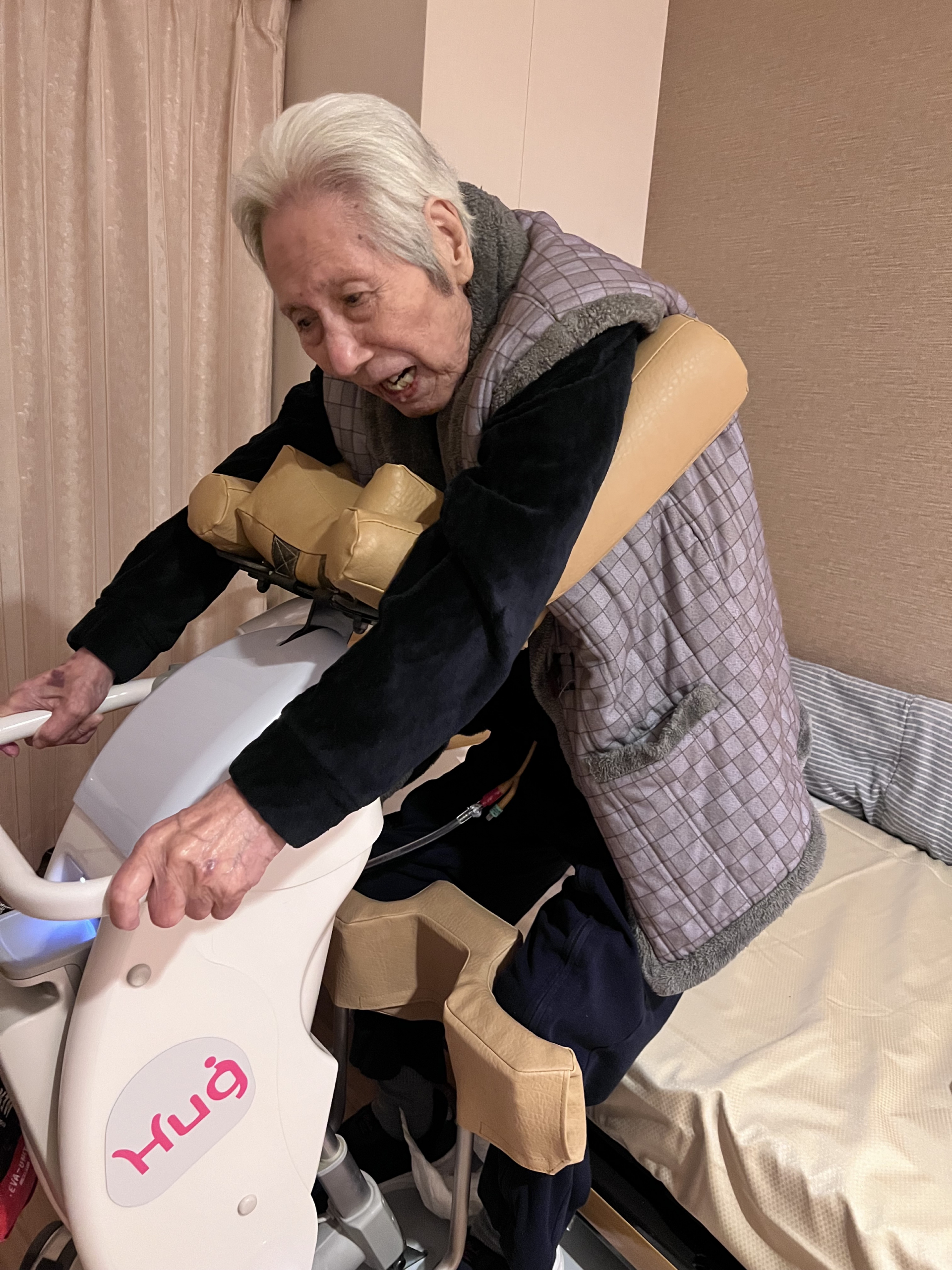 専用の立位支援機器(Hug)を使って、利用者様がゆっくりと立つ練習を行いました。