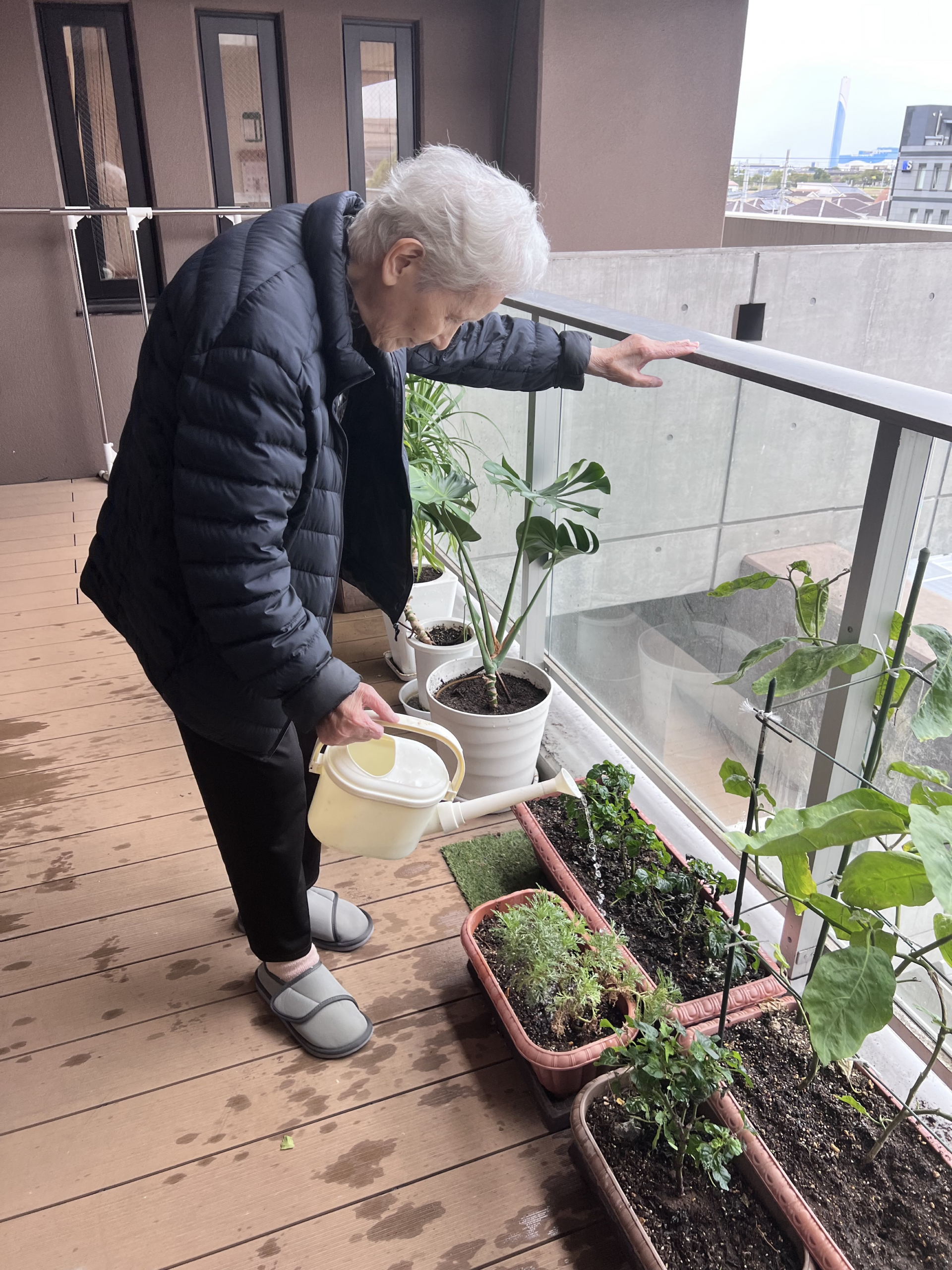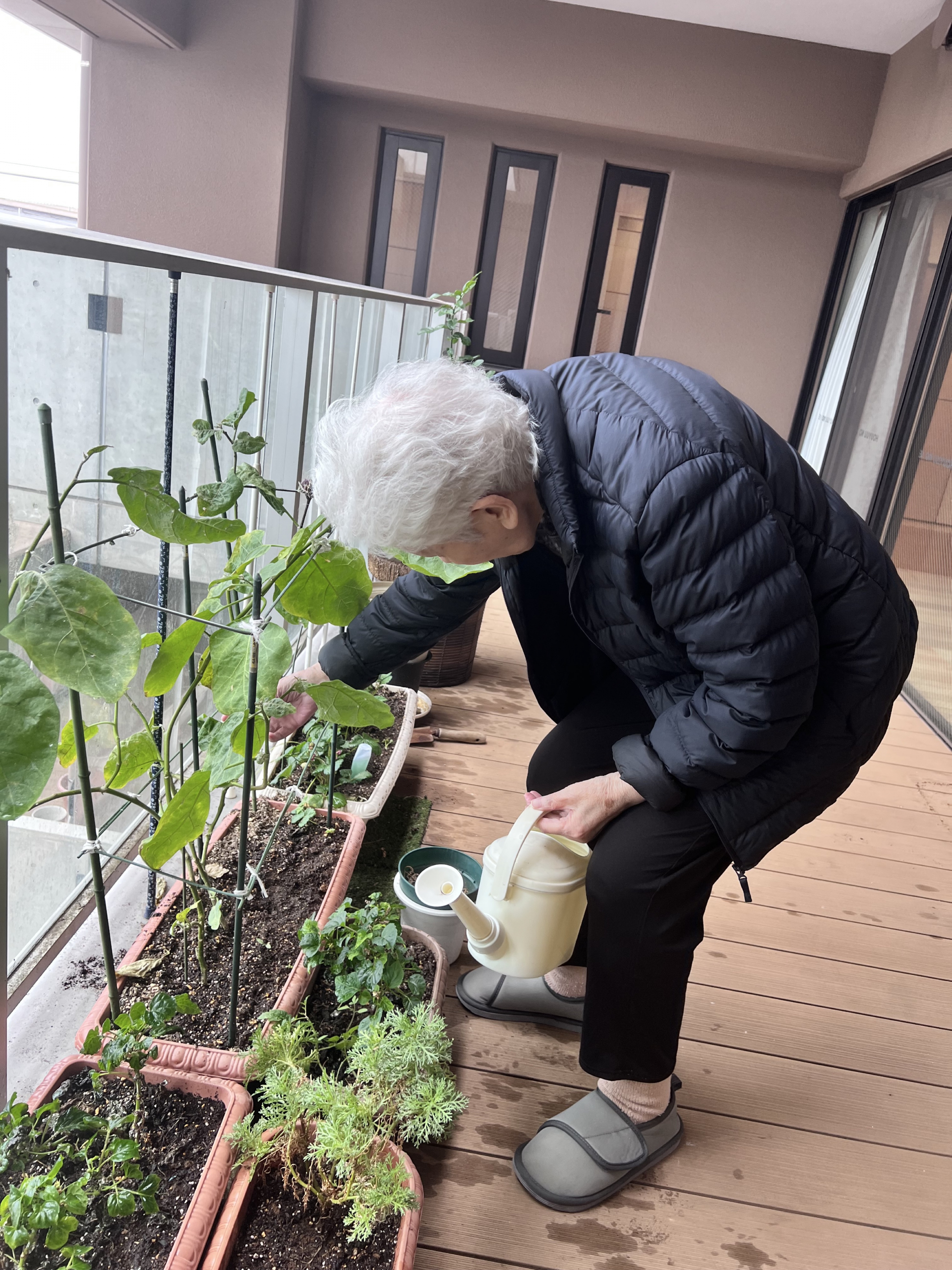 本日は、利用者様と一緒にバルコニーの菜園を見に行きました。