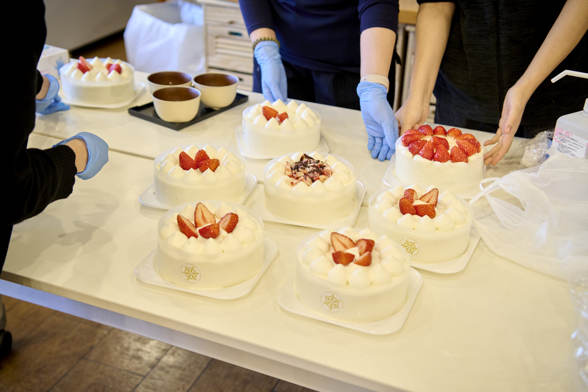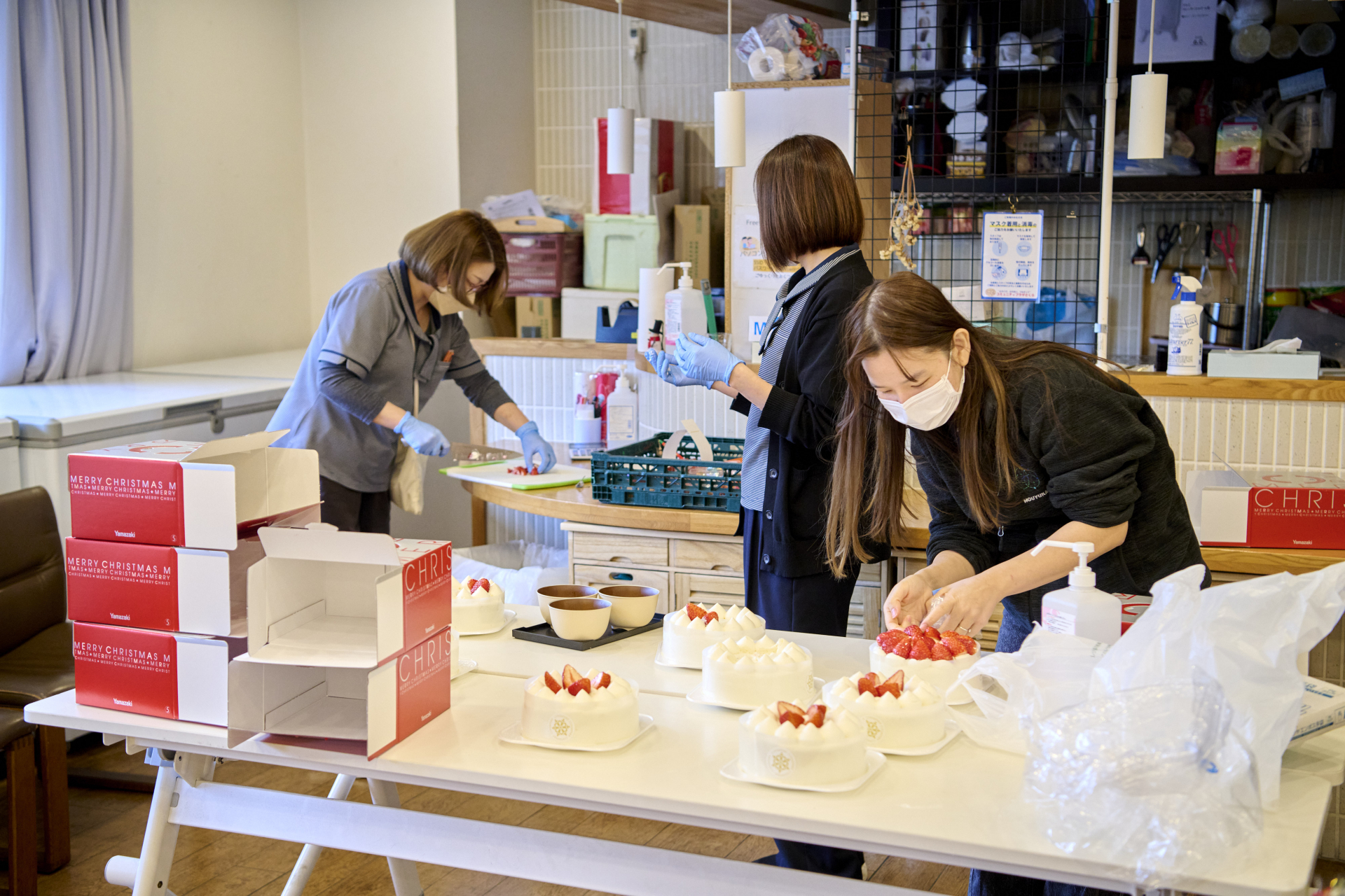準備ができたら大勢の職員サンタが、各ユニットにケーキを届けに♬ もちろんトナカイを連れて、、
