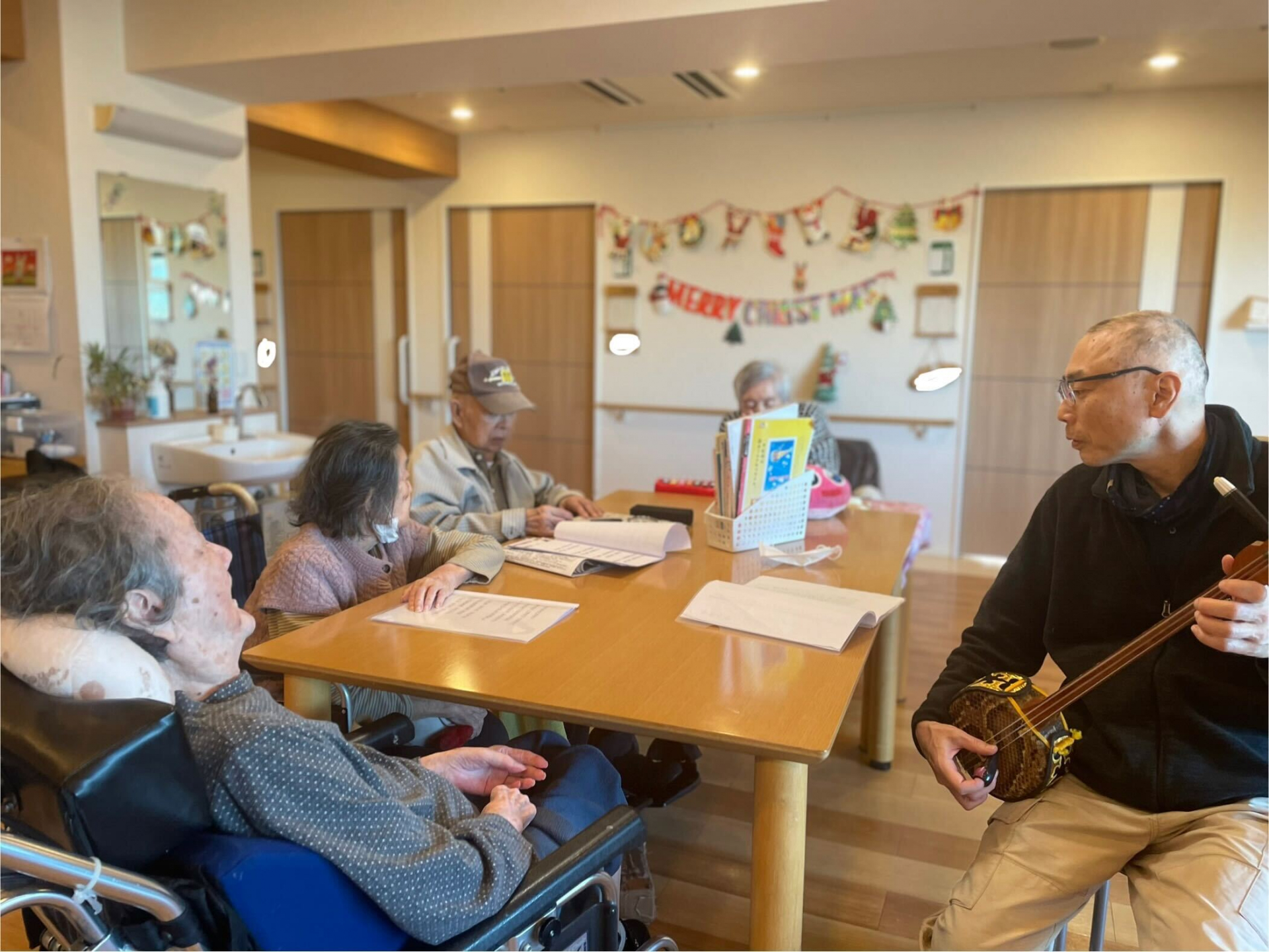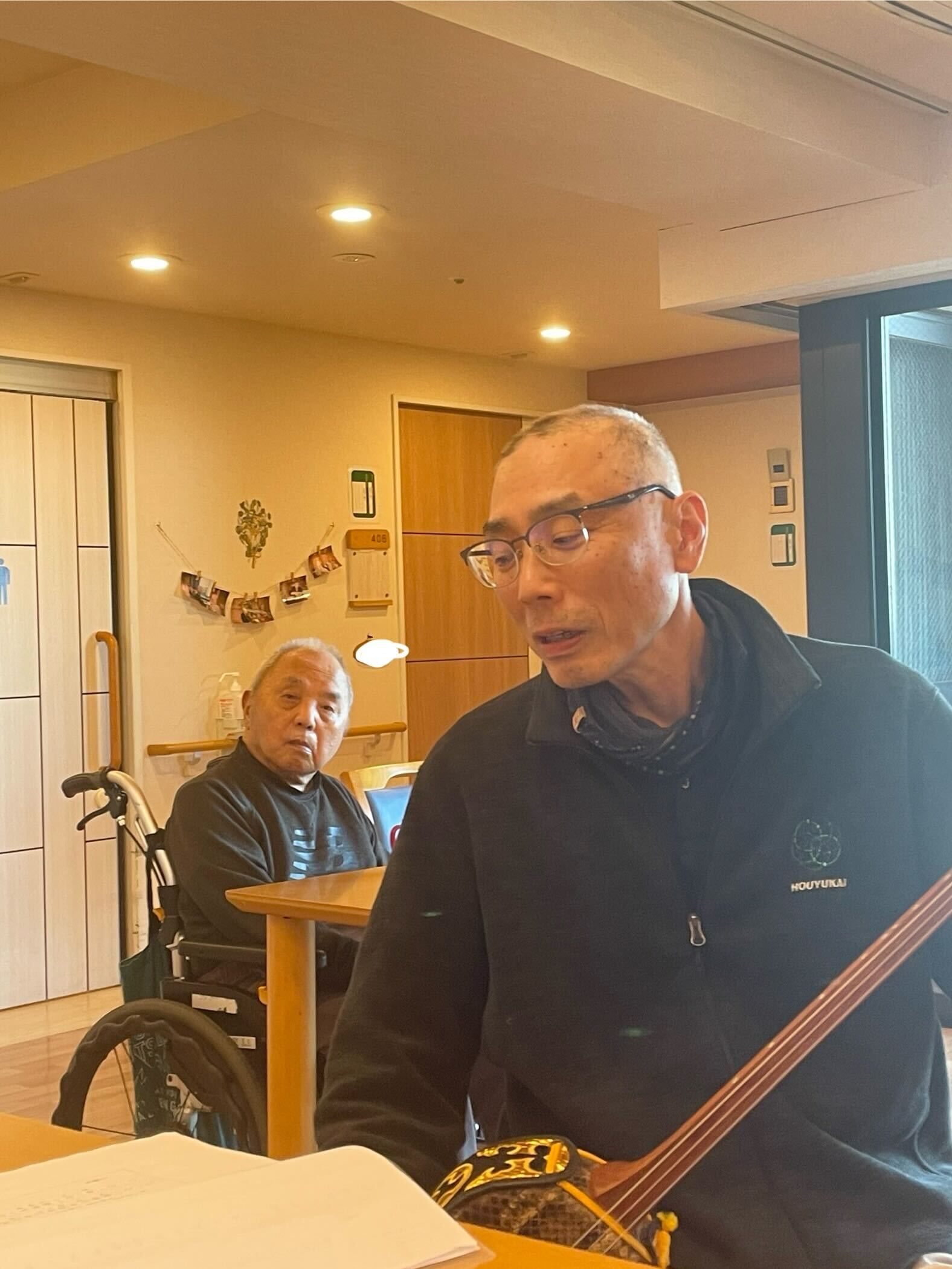 三線の演奏を楽しまれています。 音に集中しながら、落ち着いた時間を過ごされています。