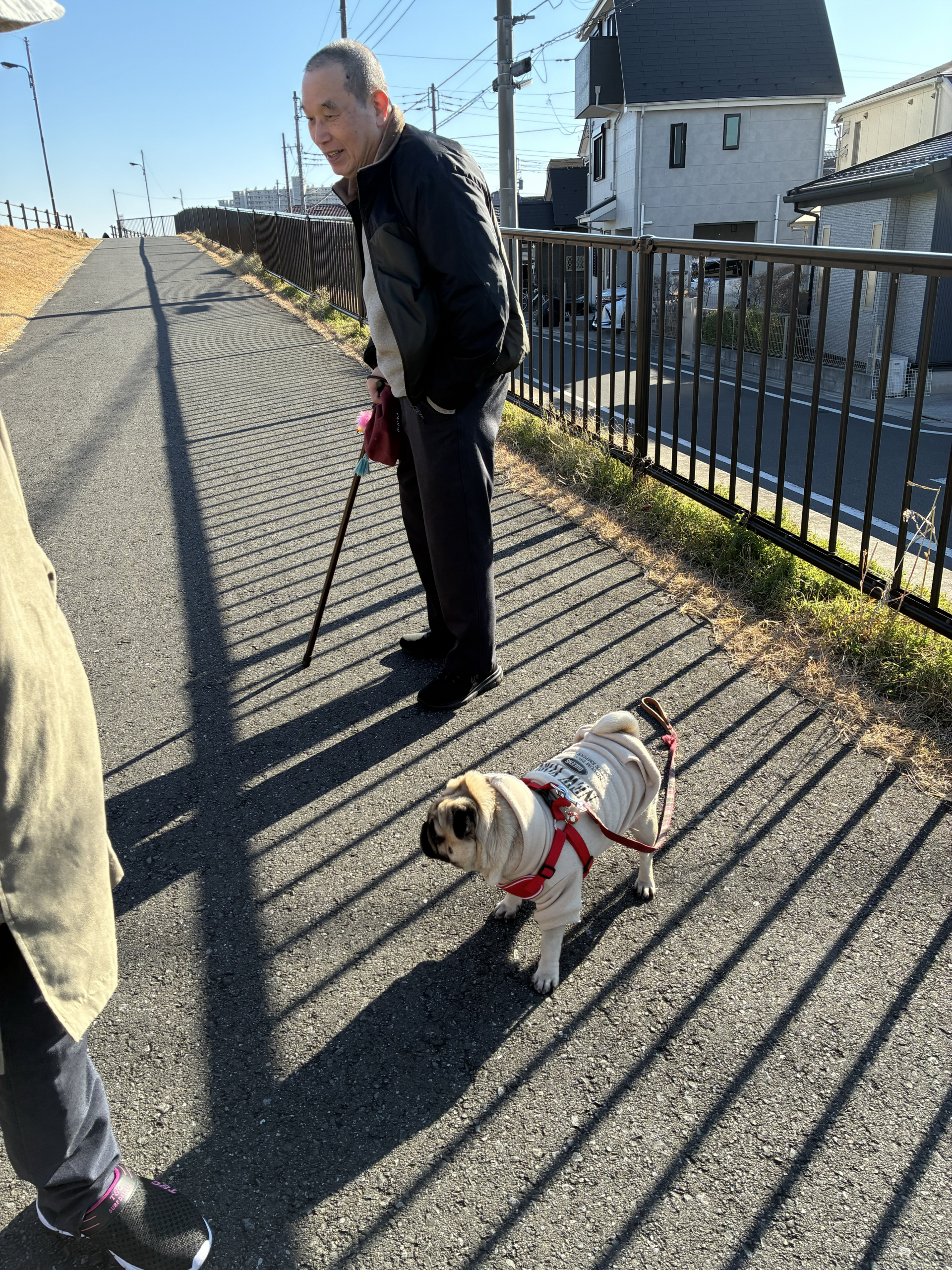 帰りは土手を散歩し、途中で出会ったワンちゃんと触れ合う場面もあり、