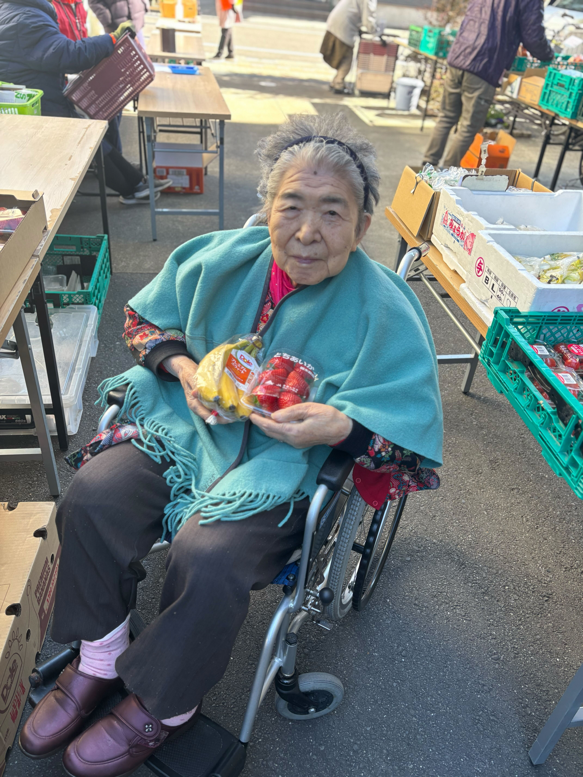 施設の野菜販売へ出かけました。ご自身で選ばれたバナナといちごを手に、にっこり笑顔。「どれにしようかな」と楽しみながらお買い物をされ、外の空気を感じる、心弾む時間となりました。
