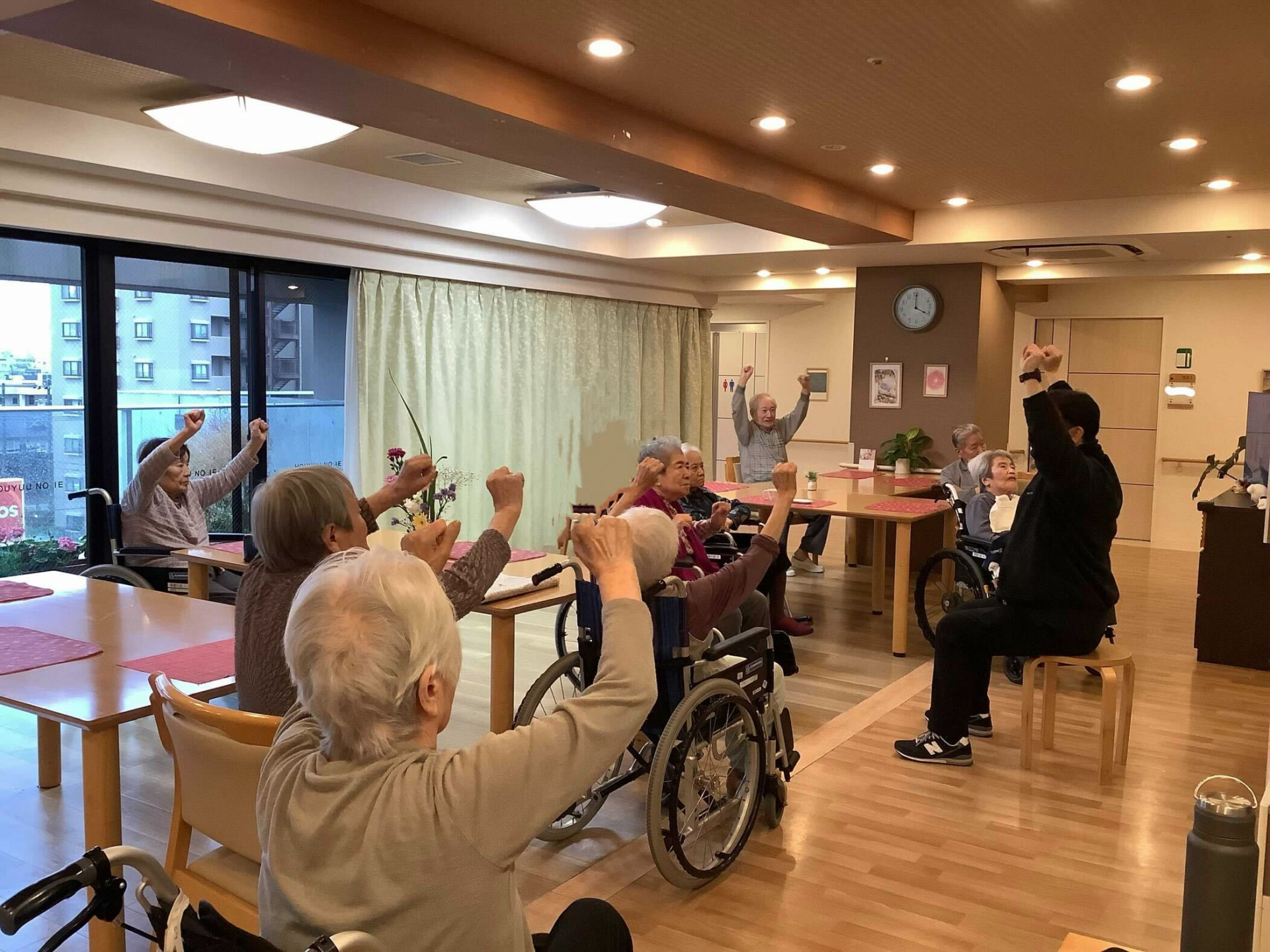 職員の声かけに合わせて、皆様で体操を行いました。腕を大きく上げたり、体を動かしたりと、無理のない範囲でしっかり参加されています。「気持ちいいね」と笑顔も見られ、心も体もすっきりする、活気ある時間となりました。