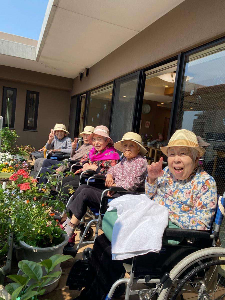 暖かな日差しの中、ベランダで日光浴を行いました。色とりどりのお花に囲まれながら、皆様で楽しくお話しされ、笑顔あふれる時間となりました。「気持ちいいね」「お花きれいだね」と会話も弾み、和やかな雰囲気に包まれていました。