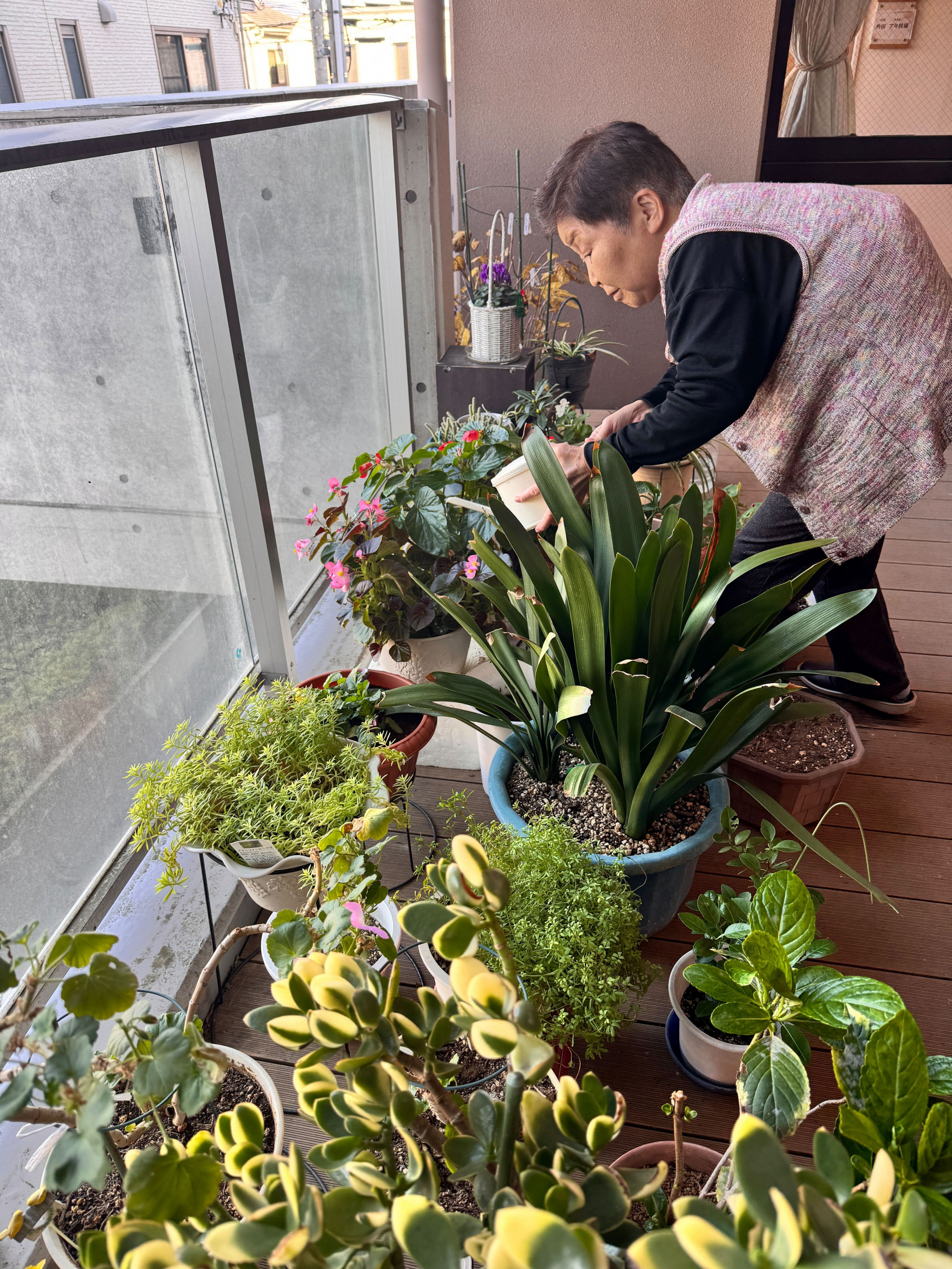 フロアの扉を開けて、ベランダの植物のお手入れ。