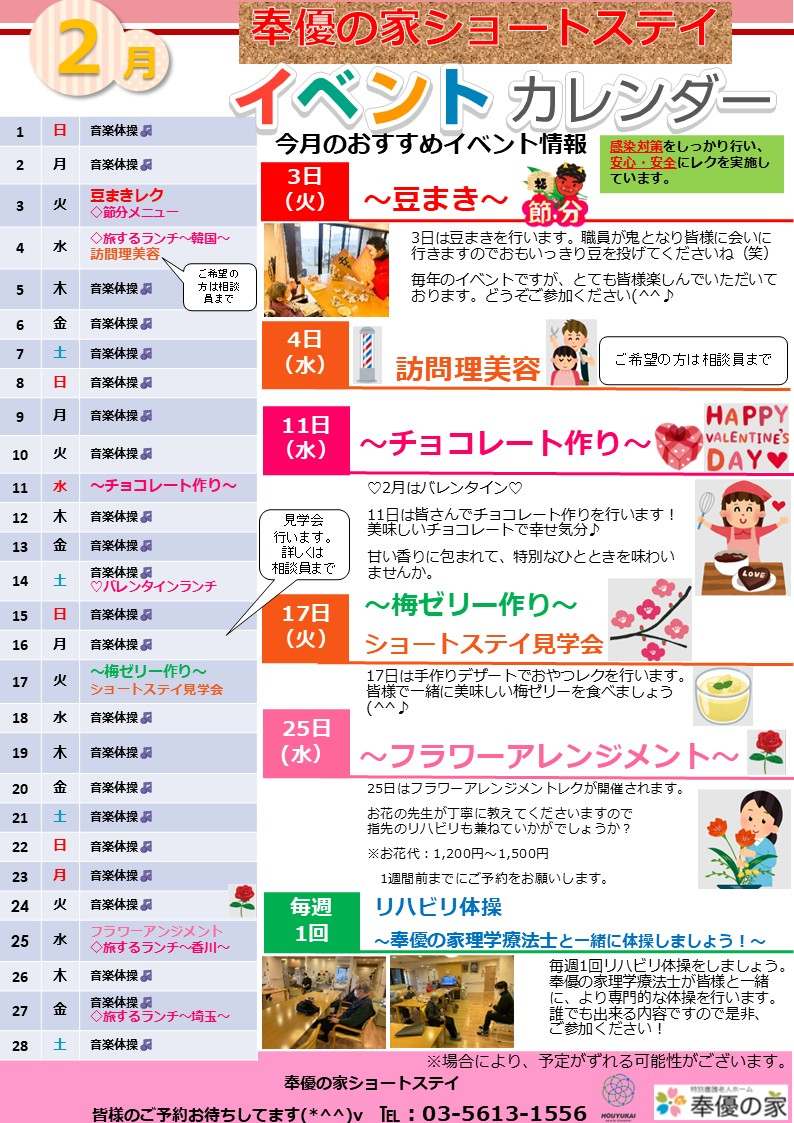 2026.01.26 お知らせ 2月イベントカレンダー Tweet シェアする 皆様こんにちは!! 奉優の家ショートステイは2月も楽しいイベントをたくさん企画していますのでぜひご利用ください! 支援課 五十里 前の記事 2026.01.26 お知らせ 【奉優の家ショートステイ見学会】 次の記事 2026.01.16 お知らせ ♦美味しい食事♦2月の献立表を更新しました 一覧へ戻る