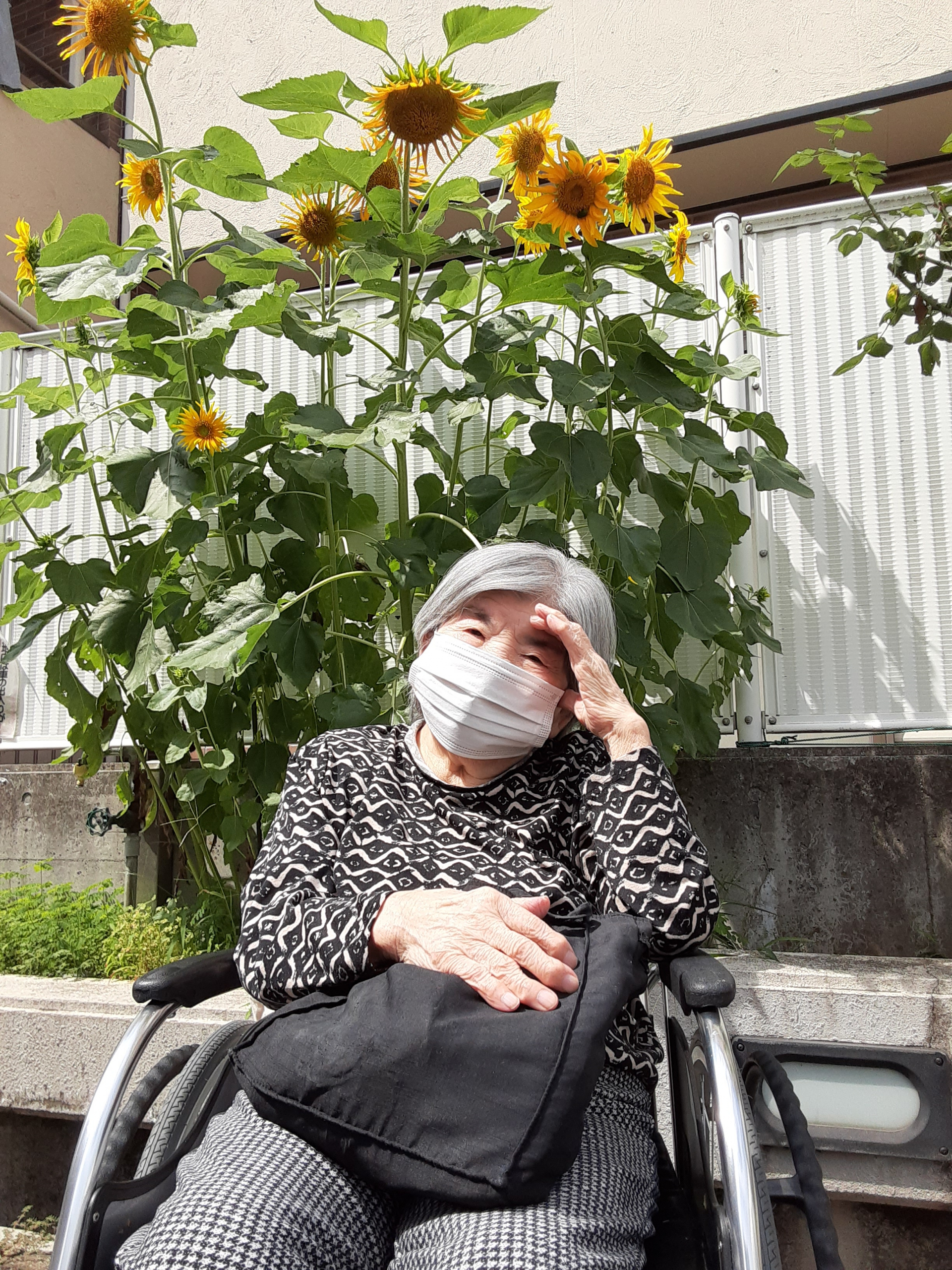 花の木ハイムの花壇に並ぶボランティアさんが植えてくれたかわいいヒマワリたちに挨拶。ヒマワリを見上げると姿勢もよくなります!