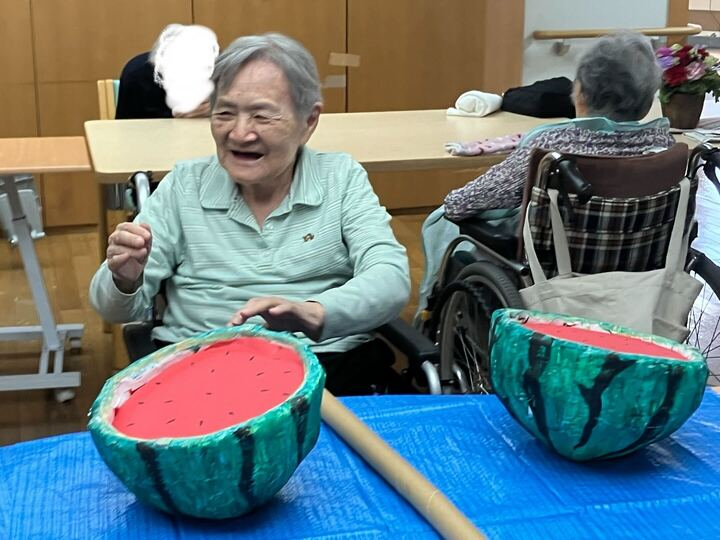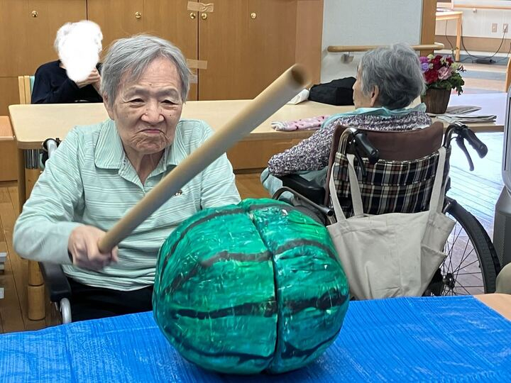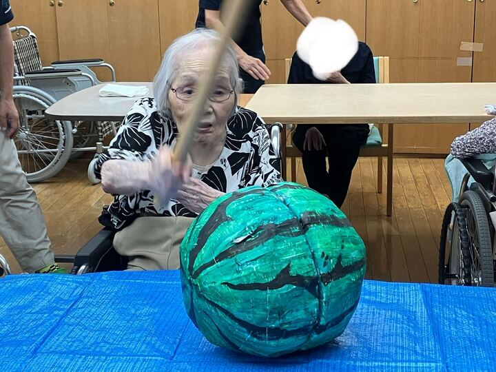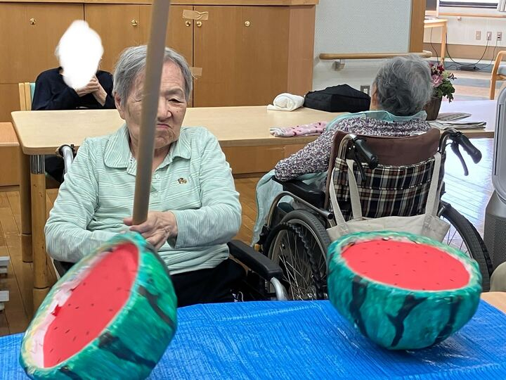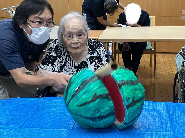 2024.08.02 活動報告 3階フロアでもすいか割り Tweet シェアする いつも花の木ハイム荒川のホームページをご覧いただきありがとうございます。 先日、3階フロアですいか割りしました。 みなさま紙の棒がしなるほど、力いっぱいすいかを割っていました! 介護課 Y 前の記事 2024.08.03 活動報告 正面玄関の美化活動 次の記事 2024.08.02 活動報告 スイカ割っちゃいました! 一覧へ戻る