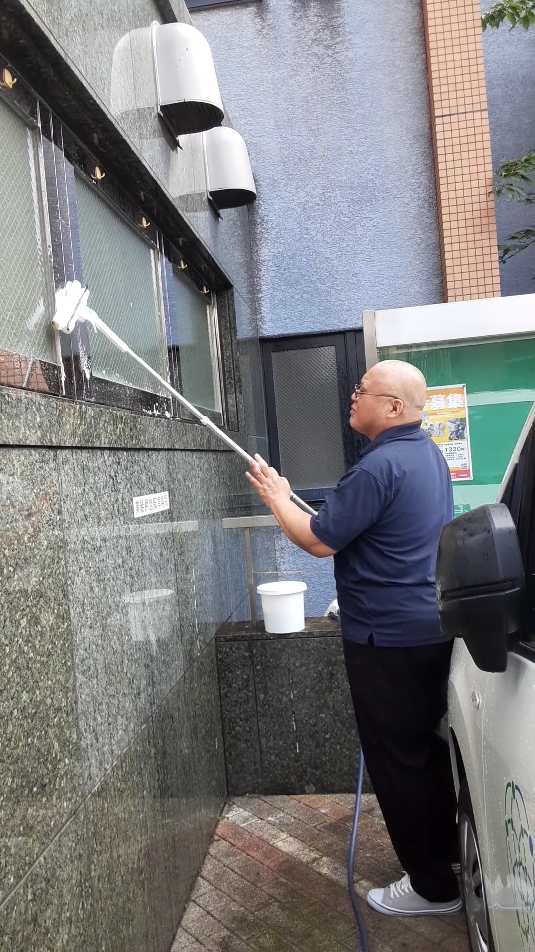 職員が高圧洗浄機でタイルに目詰まりしている苔を一気に掘り起こします!「あっつい!」と汗だくになりながらも頑張る職員。でもやる気スイッチが入り、草むしりも窓清掃も!