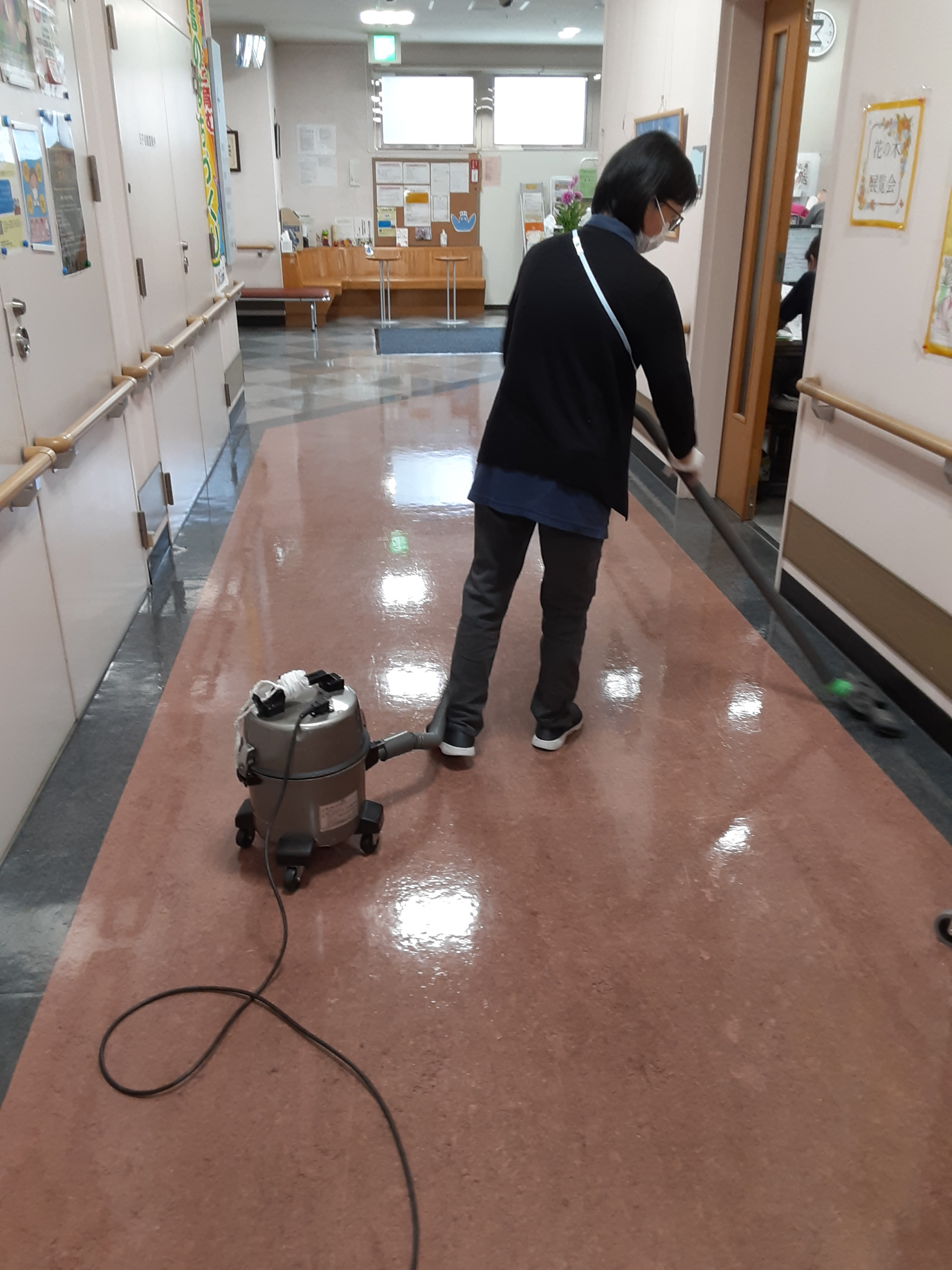 施設1階の玄関や廊下が肌寒くなってきましたが、まだ汗をかく生活支援課の職員。せっせと玄関や廊下、階段など見えないところまで掃除機とモップを持って清掃してくれています。