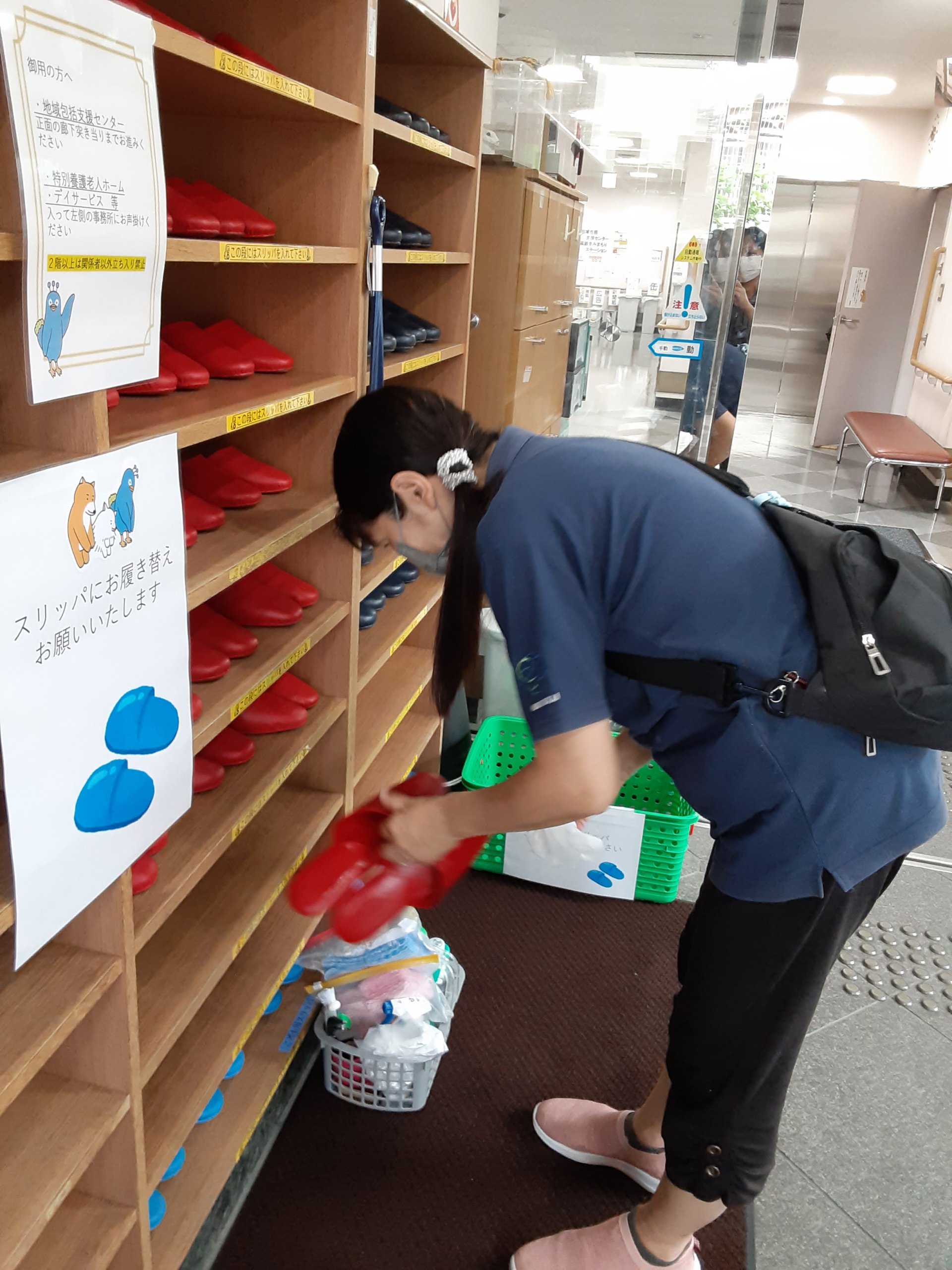 こちらも生活支援課職員により毎日使用済みのスリッパを丁寧に拭いてくれています。マットの掃除機掛けやアルコール消毒も行っていますが、時々「使用済みスリッパ入れ」の箱に靴が入っていたりと不思議な出来事も・・・