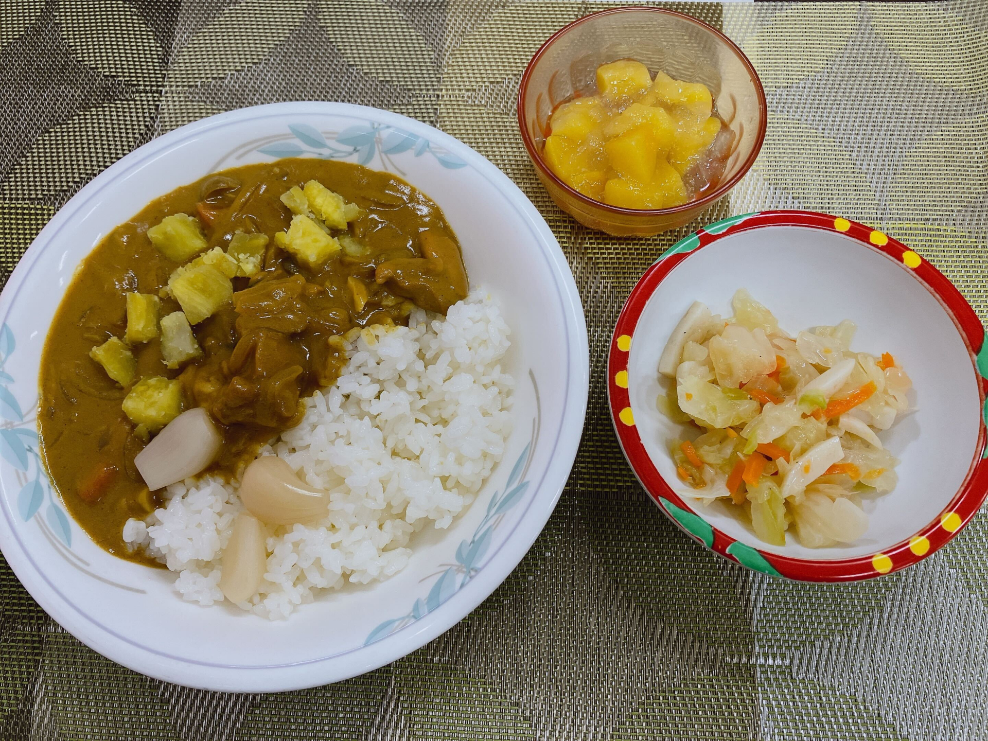上にはさつまいも、カレーには沢山のキノコが入っています。