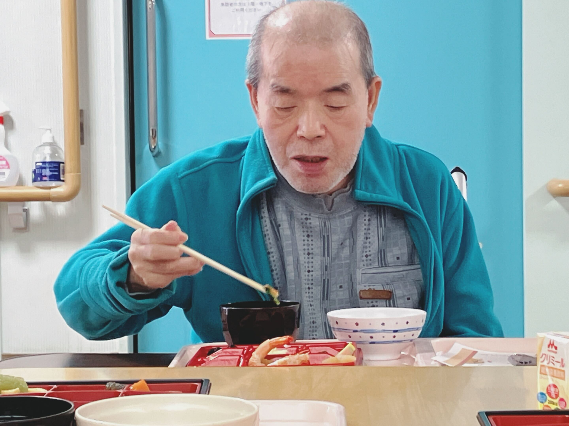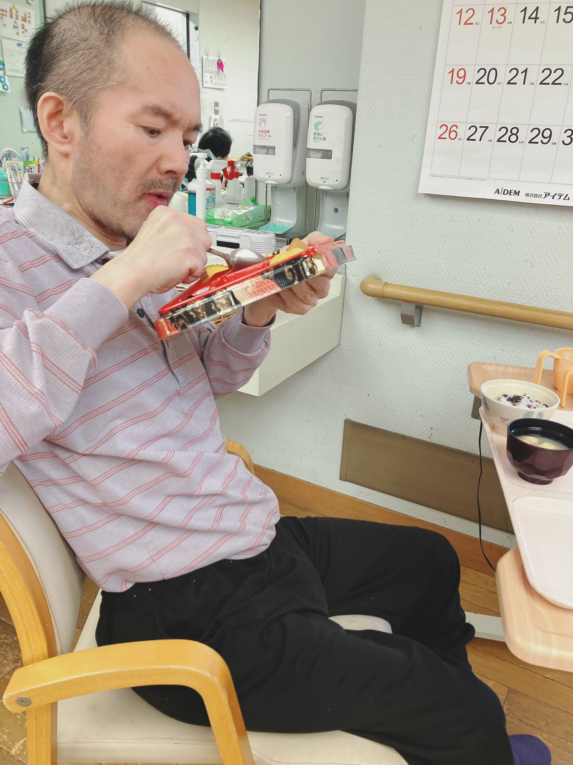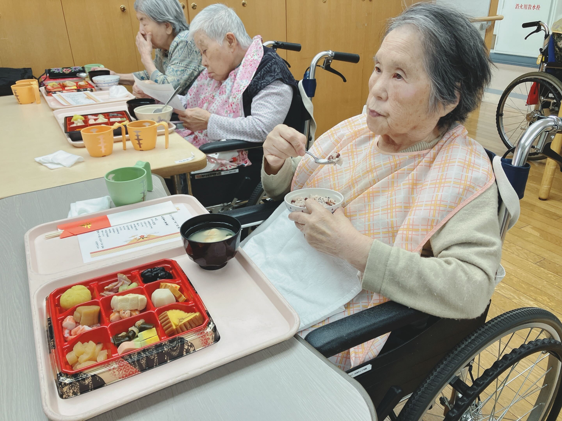 おやつには、甘酒と紅白のお饅頭をご用意しました。召し上がるのが難しい方にはようかんをご提供。