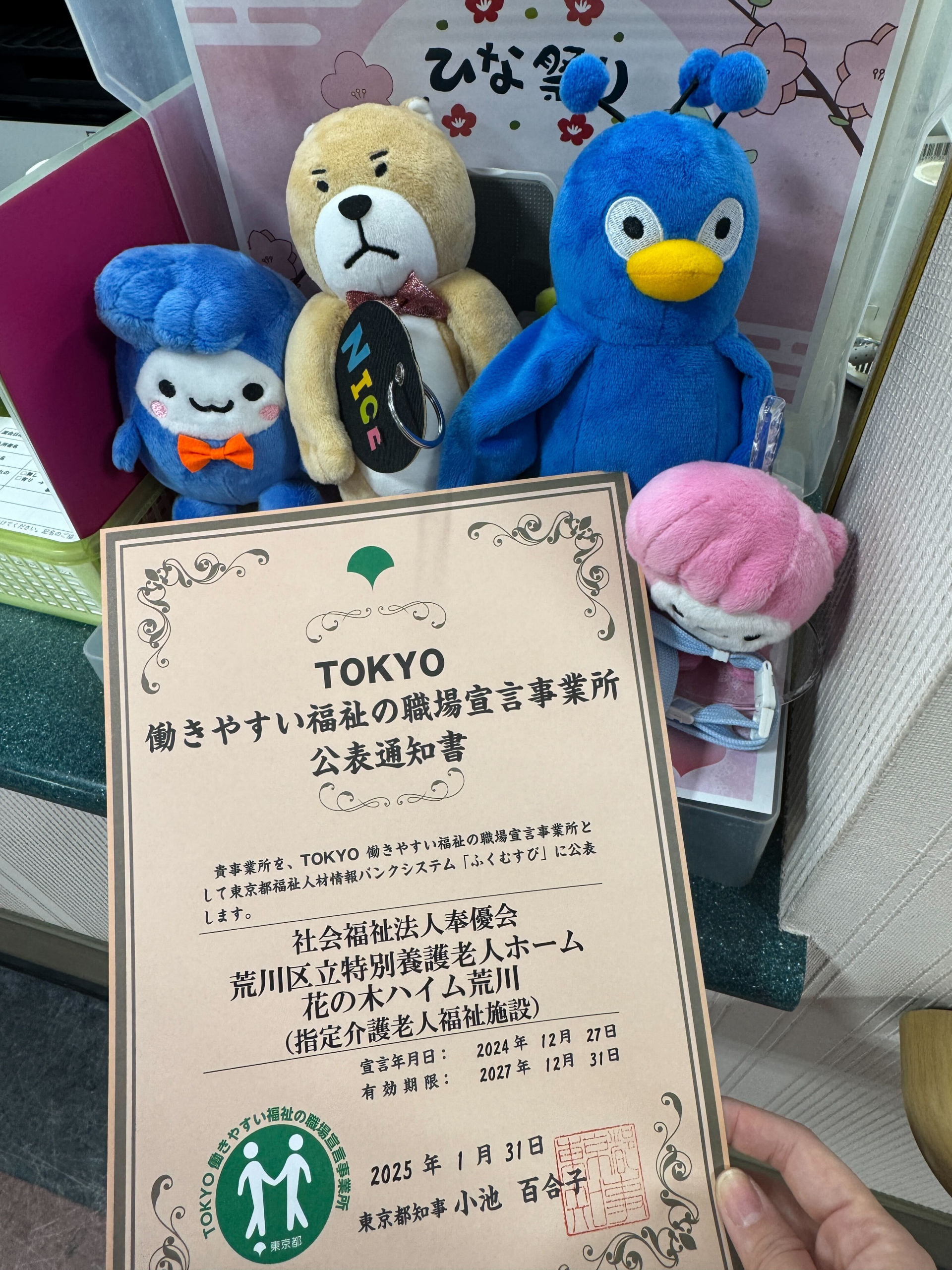 東京都から『TOKYO 働きやすい福祉の職場宣言事業所 公表通知書』が届きました!