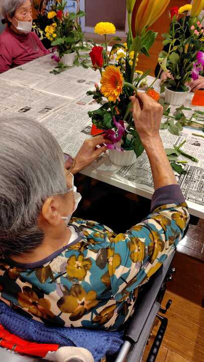 フラワーアレンジメントの先生が分かりやすく生け方を教えてくださりご入所者様もいつもやる気満々、どんどん手がすすみます。