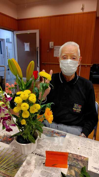 昔から土や花の手入れをするのがお好きという男性ご入所者様。いつもバランスよいアレンジメントに素敵ですね!とお声がけしたら「口がうまいねぇ」と・・・いえいえ、本当にいつも感激しています!