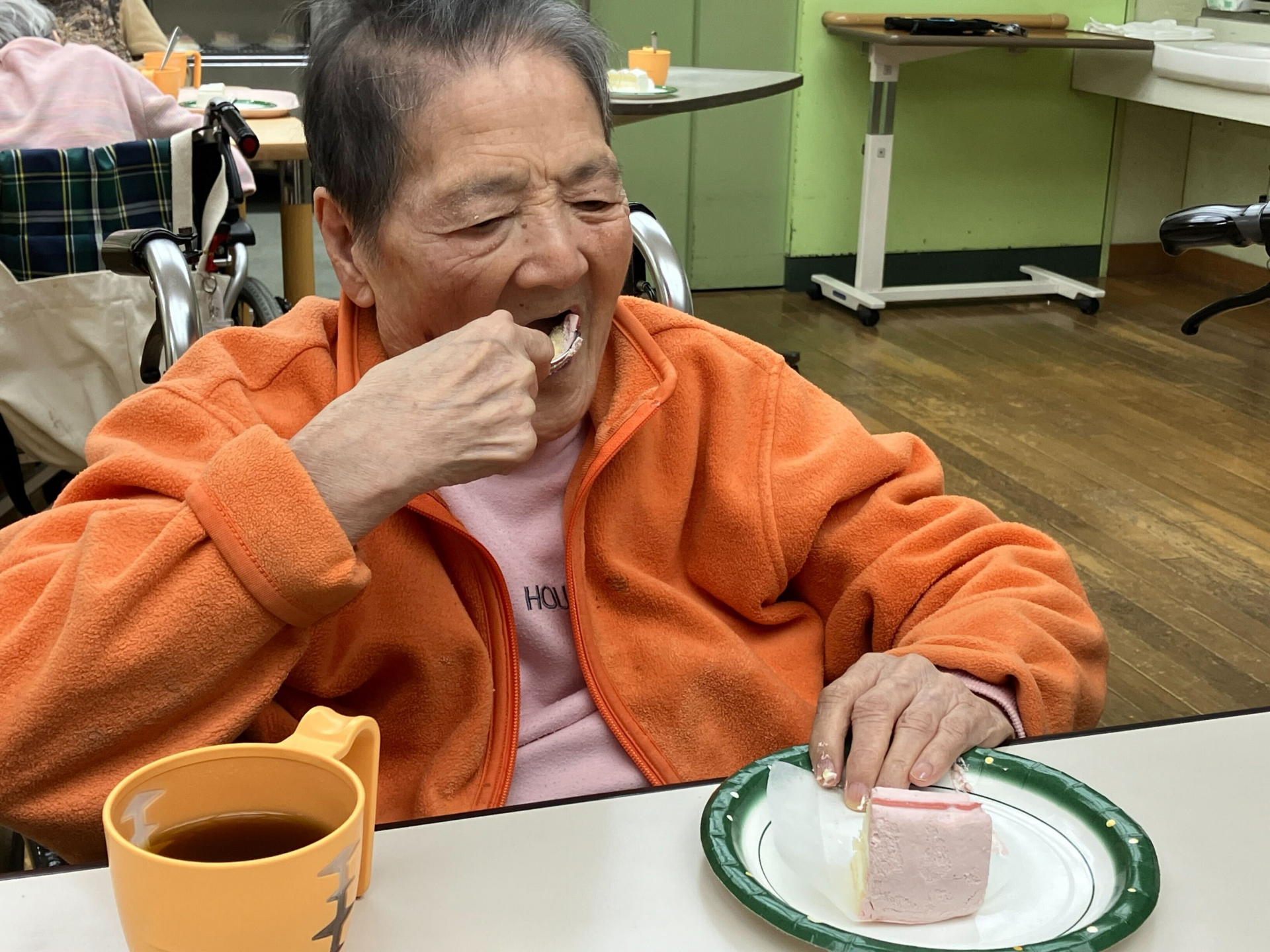 ケーキは、普段から皆さんに好評をいただいているスイーツのひとつで、この日もおやつの時間を楽しみにされているご様子がうかがえました。