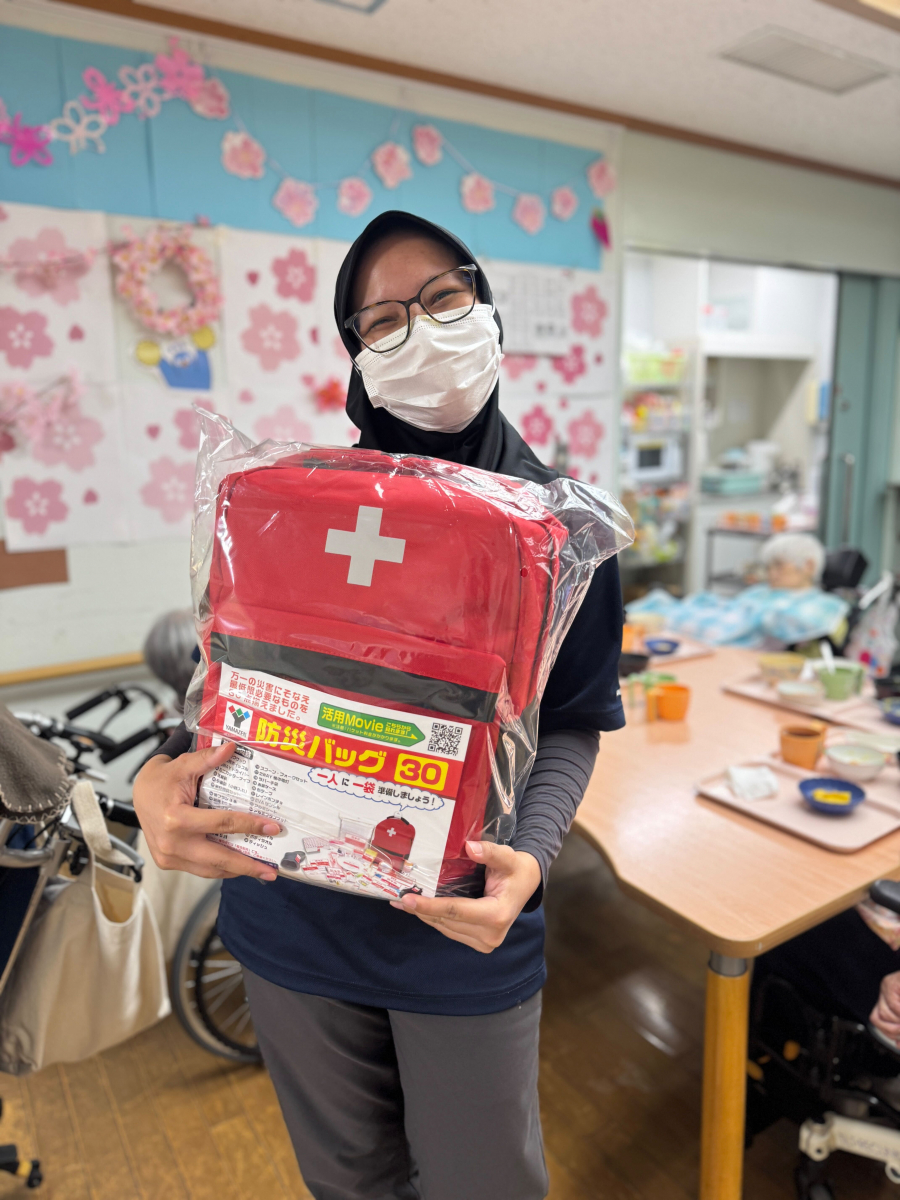 このたび、法人よりインドネシアEPA職員へ防災グッズのプレゼントがありました。