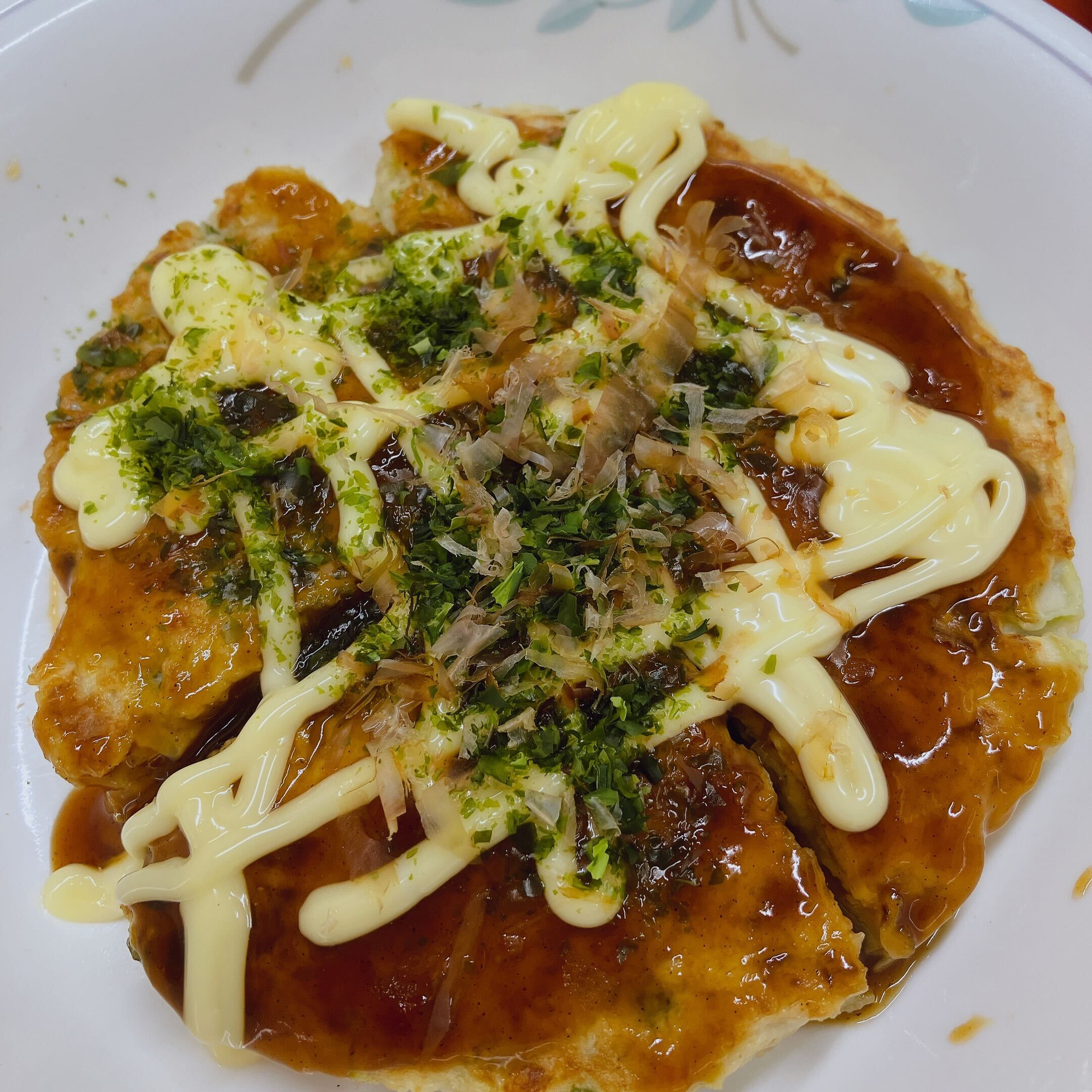 ソース、マヨネーズ、かつお節、青のりがトッピングに乗った味のしっかりとしたお好み焼きです。