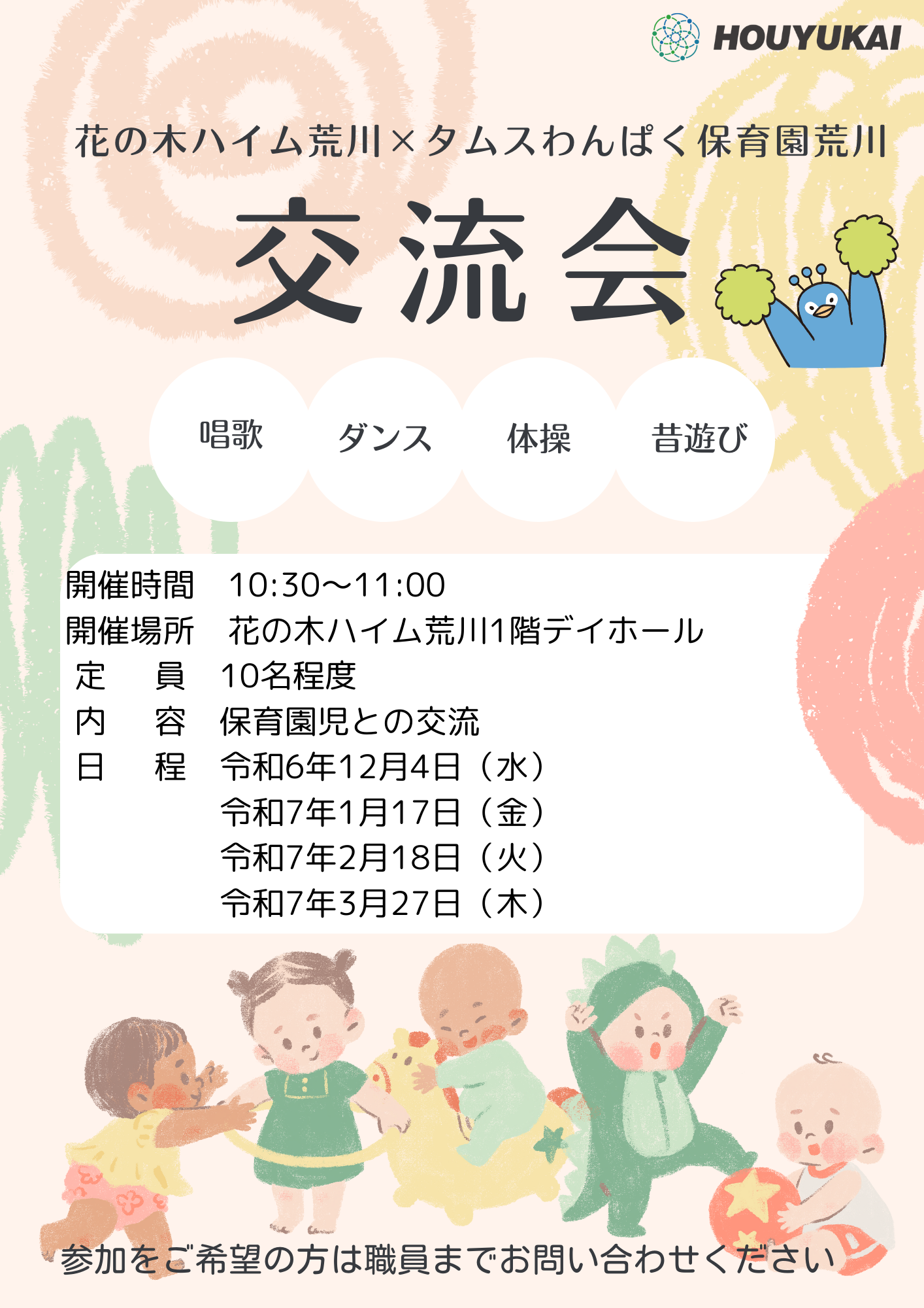 花の木ハイム荒川では、月に1回タムスわんぱく保育園さんと交流会を行っております。
