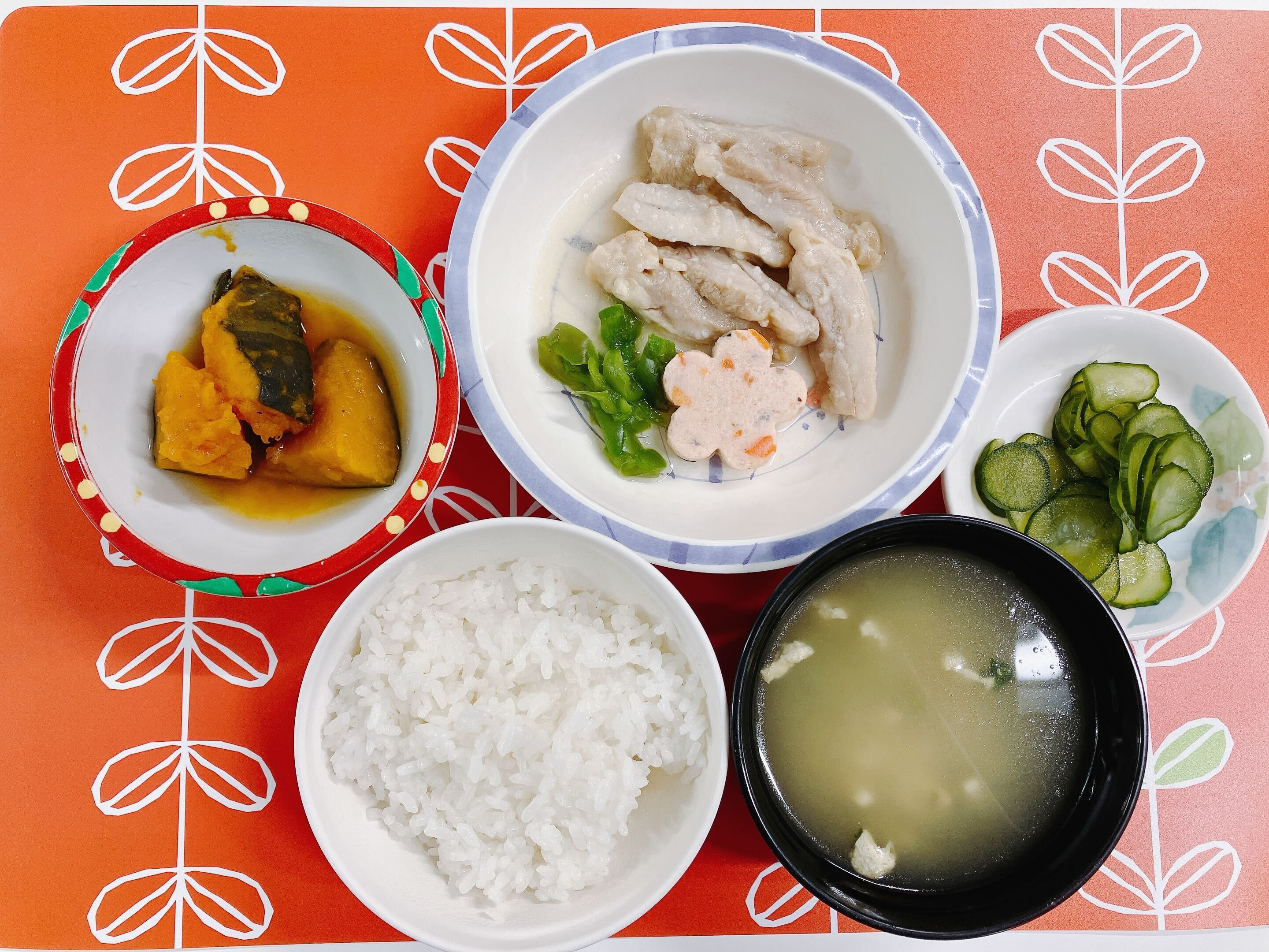 ・ご飯 ・鶏肉の塩麴蒸し ・かぼちゃの含め煮 ・胡瓜の酢の物 ・味噌汁(麦みそ仕立て)