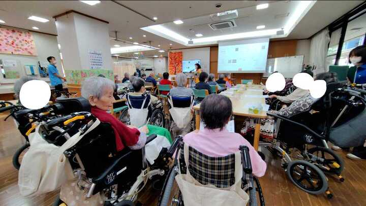 今日もたくさんのご利用者さまが集まり、沖縄三線の音色が流れるといっきに南国の空気に!普段はあまり大きな声が出ない方や、はじめは少し照れていた方も演者さんの上手な誘いにだんだんと楽しくなり「いーやーさーさー!」と合いの手を入れてくれます。