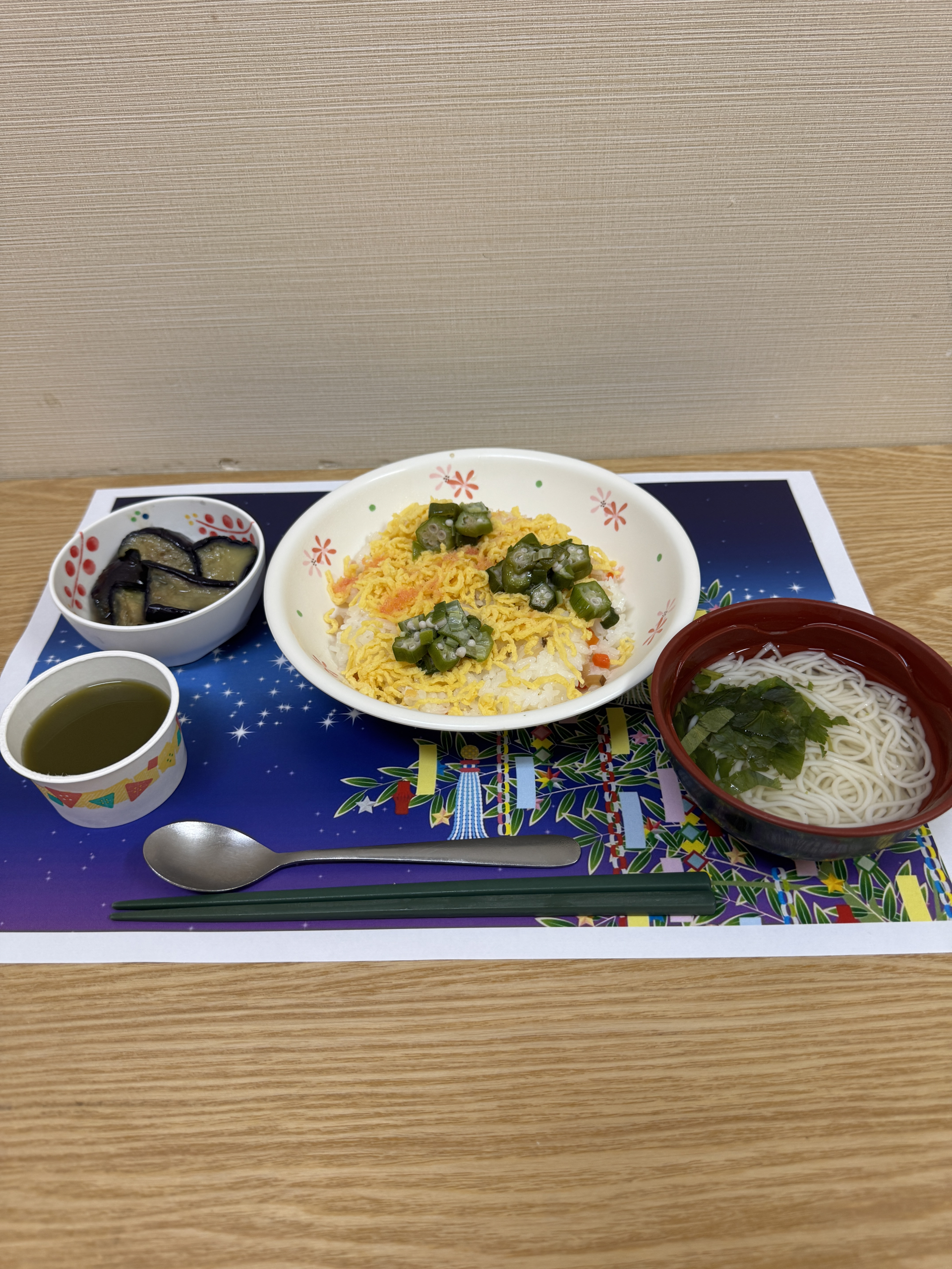 ばらちらしとそうめんをご用意いたしました★見た目も涼しげで、食欲をそそる一皿となりました。「きれいね!」「七夕らしくてうれしい」と、皆さま笑顔で召し上がっていらっしゃいました。