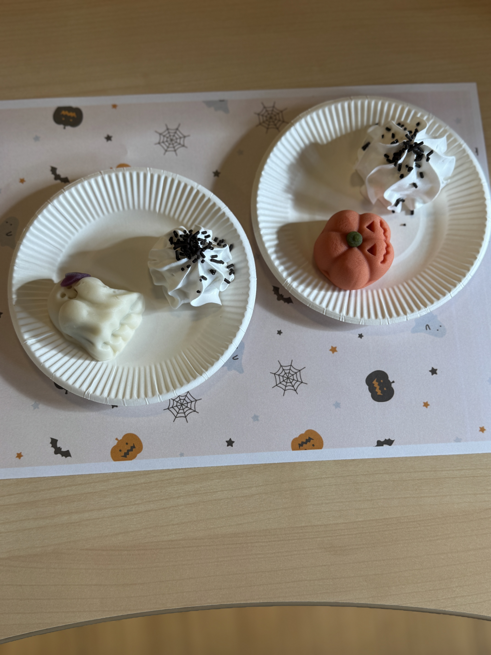 お化けとカボチャをモチーフにした練り切りと、まろやかなカボチャムースをご用意し、季節感あふれるおやつのひとときをお楽しみいただきました。