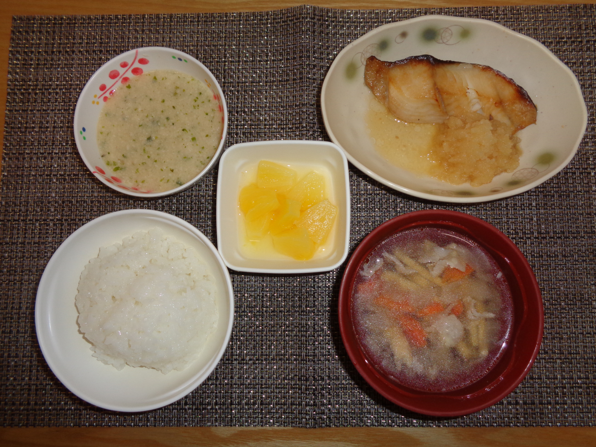 今日お昼は銀だらの照り焼き、とろろ芋、塩豚汁、パイン缶でした。