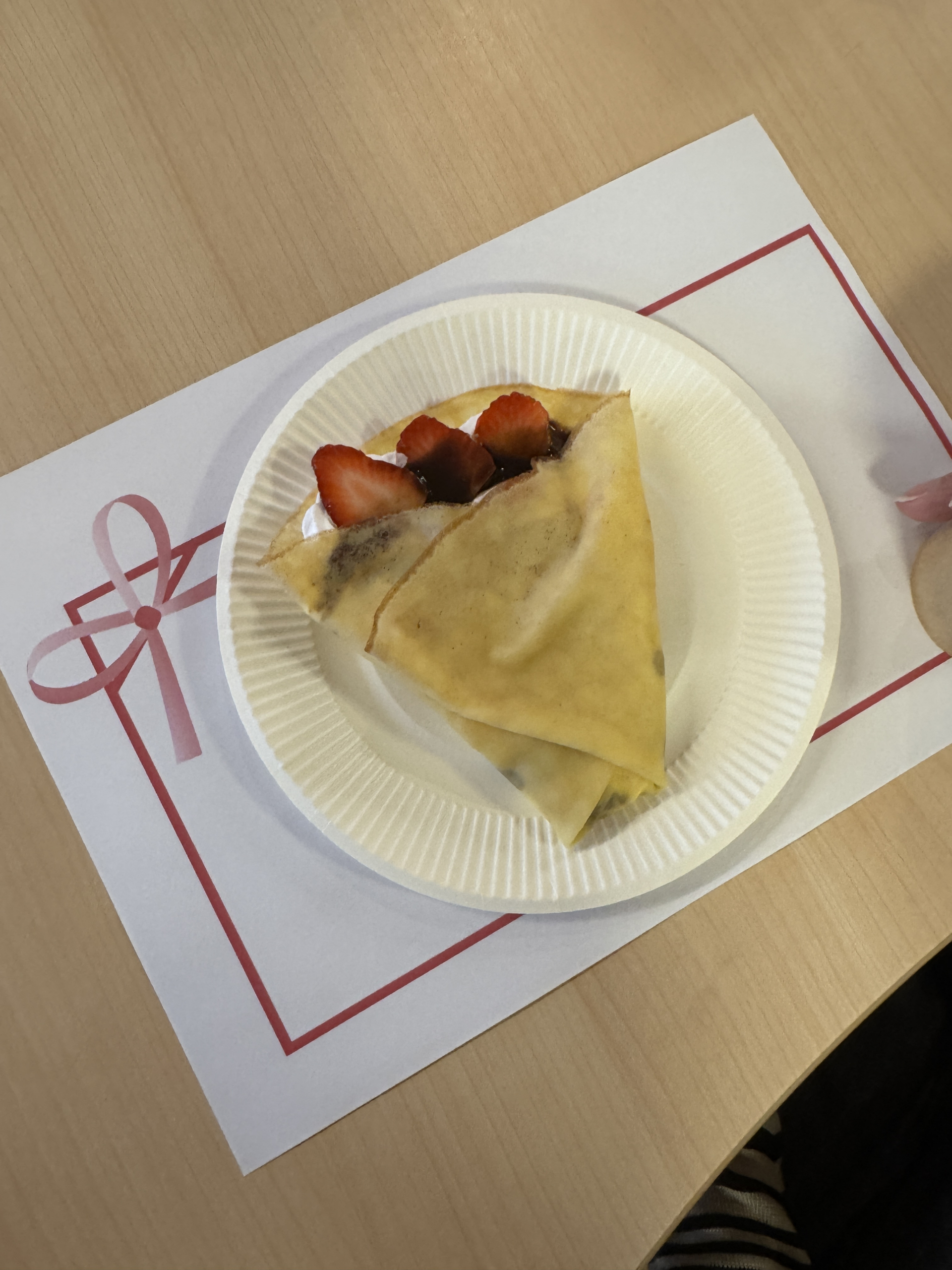 メニューは苺クレープです♩やわらかい形態を召し上がっている方にはいちごムースをご用意。