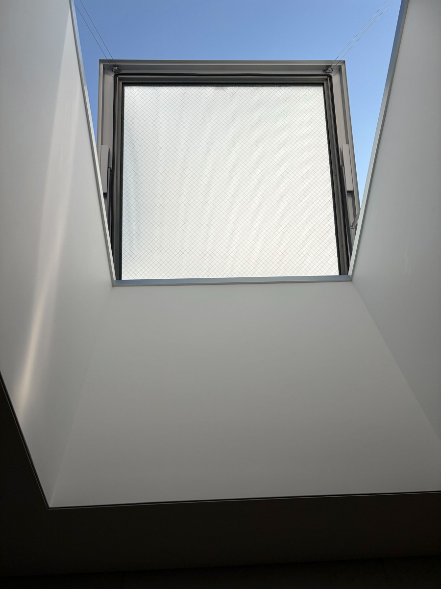 玄関前には天窓があり、開けるとやさしい光が差し込み、心地よい風がふわっと入ってきます。自然の光と風を感じられる、気持ちのよい空間です!