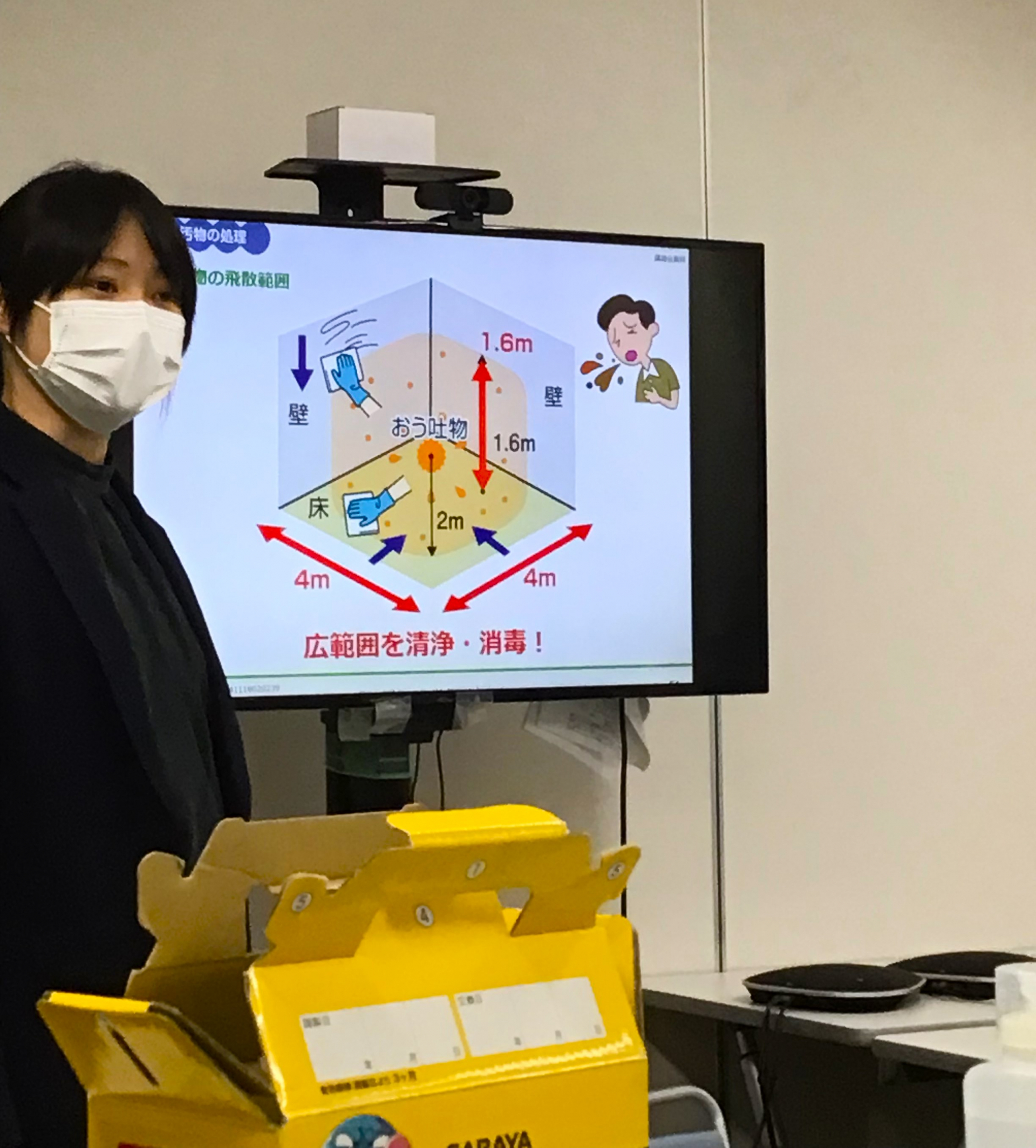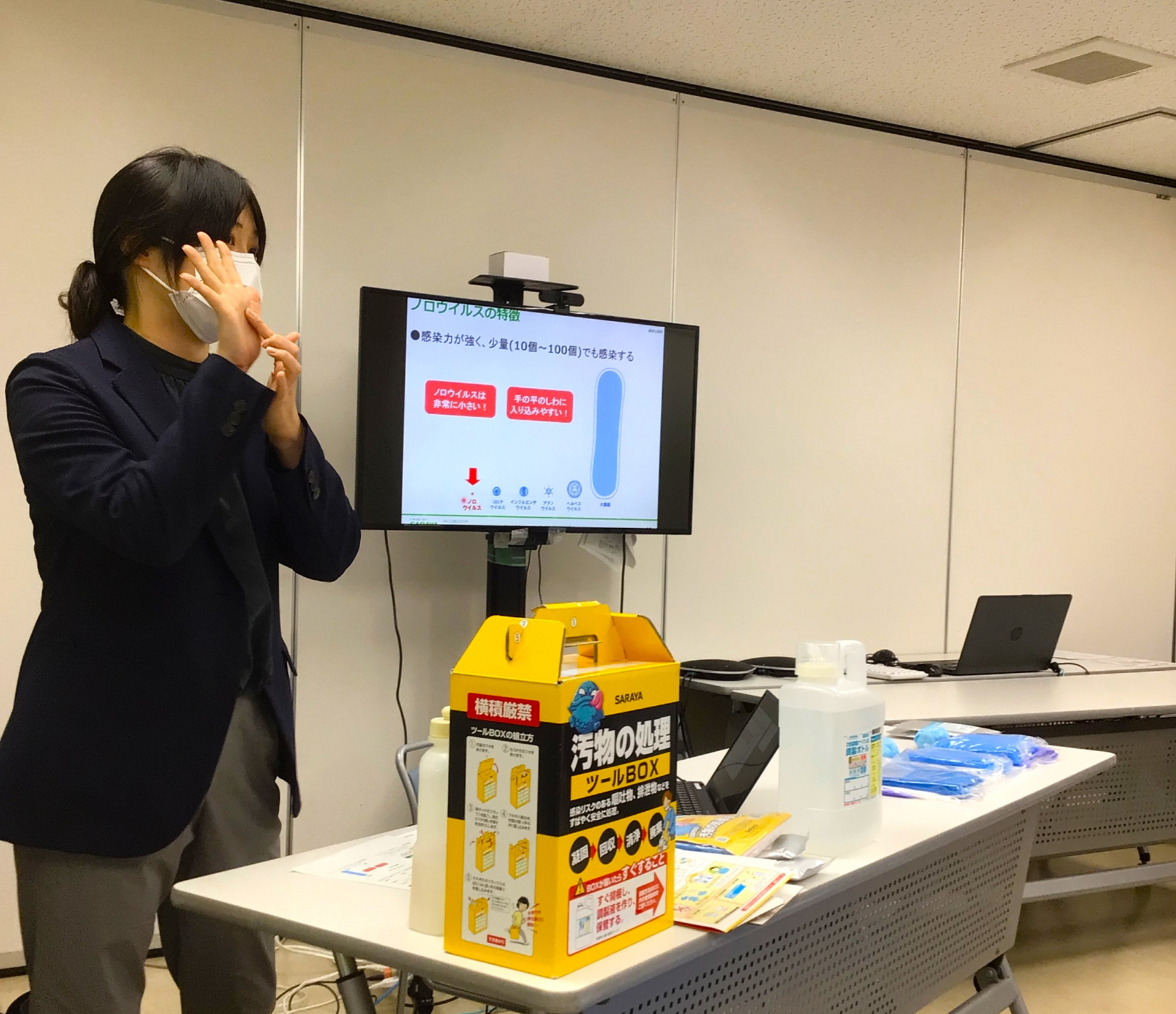 施設全体で対策を確認するため、東京サラヤさんに来ていただき研修会を開催しました。
