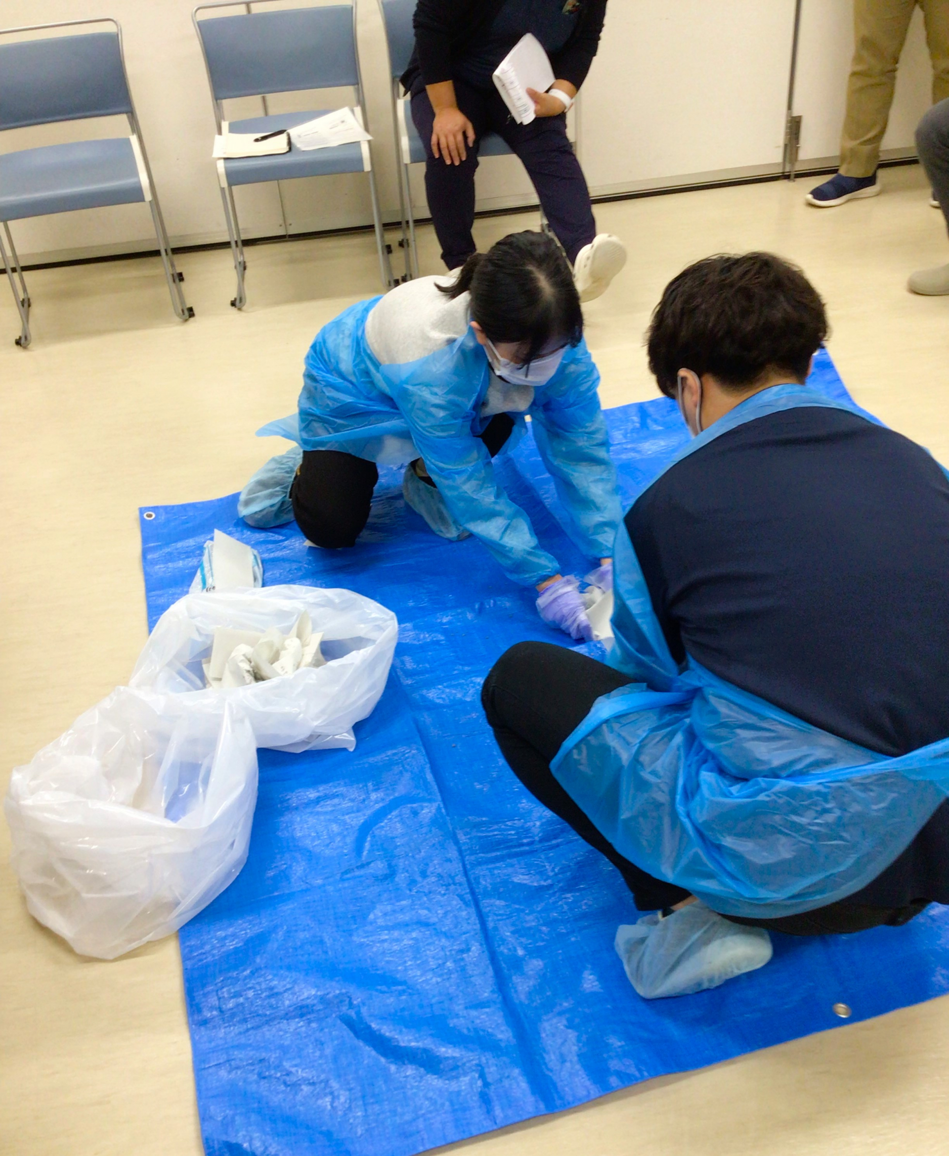 嘔吐物に見立てたものを広げないように回収中。処理方法を、実際に体を動かして学びました。