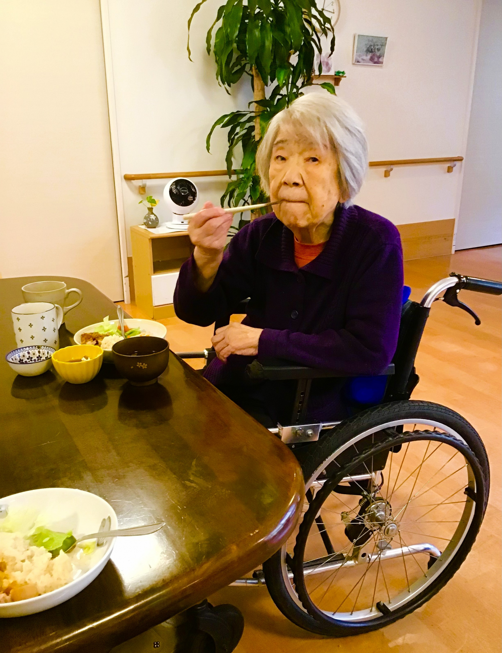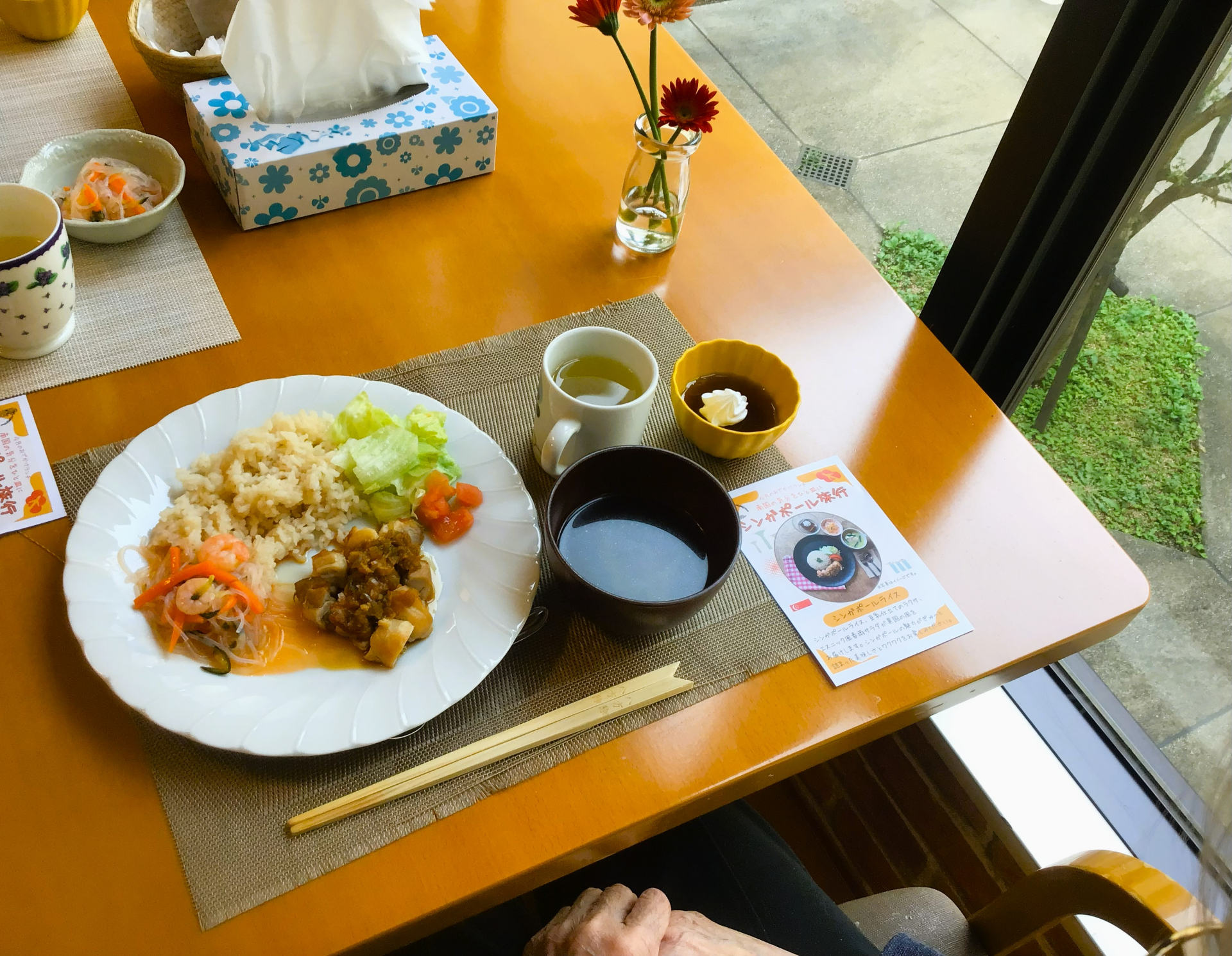 鶏のだしで炊いたご飯に鶏肉が添えられたチキンライス。「からいわね」などと、いつもとは少し違う雰囲気のお料理に興味を持ちながら召し上がっていらっしゃいました。