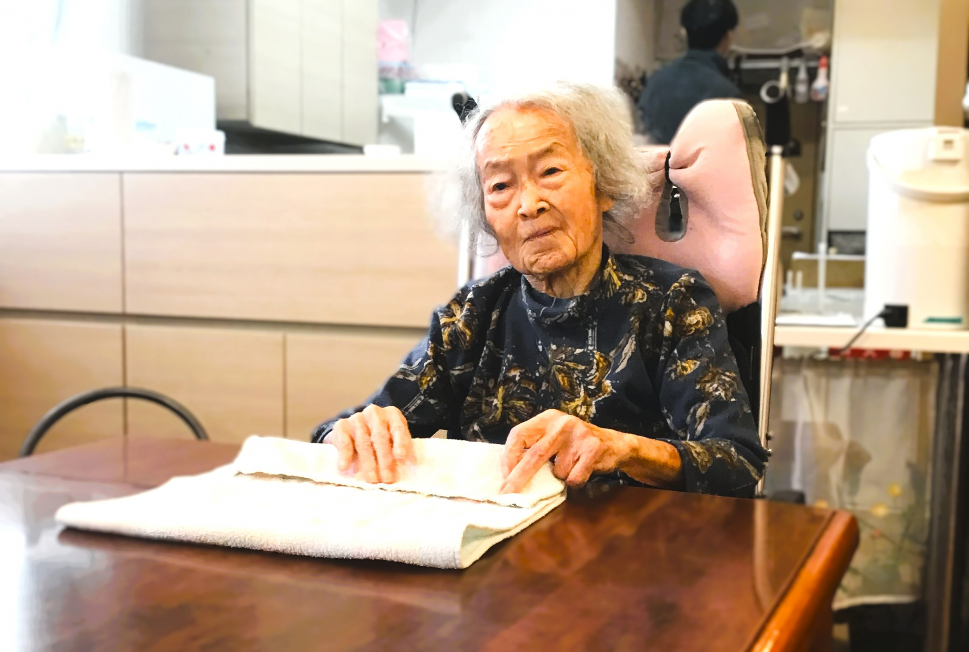 職員と一緒におしぼり巻きをして過ごされたり、
