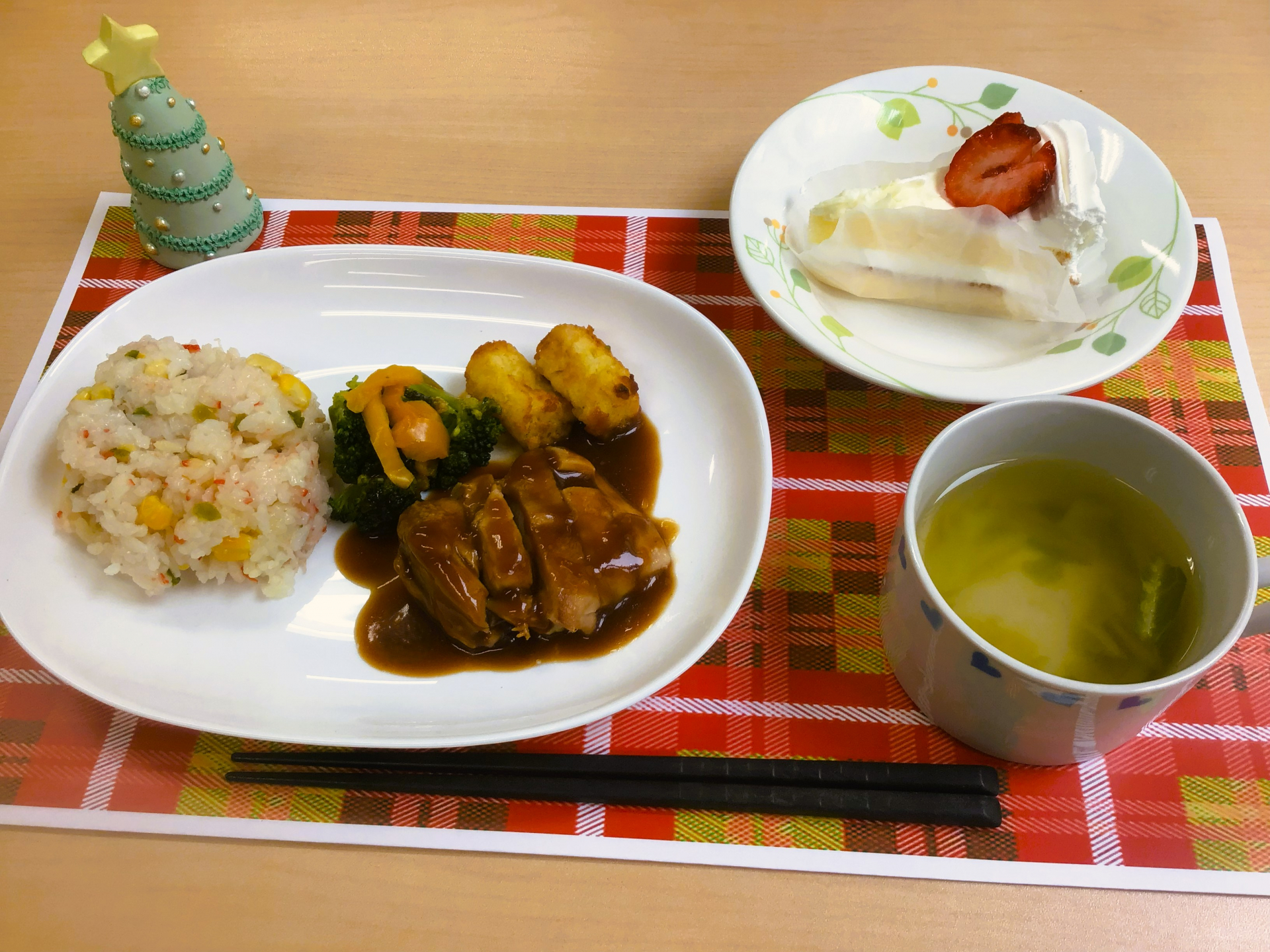 12月25日はクリスマスメニューでした。カニ風味ピラフのクリスマスプレート、いちごがのったケーキやデザートを楽しまれました。