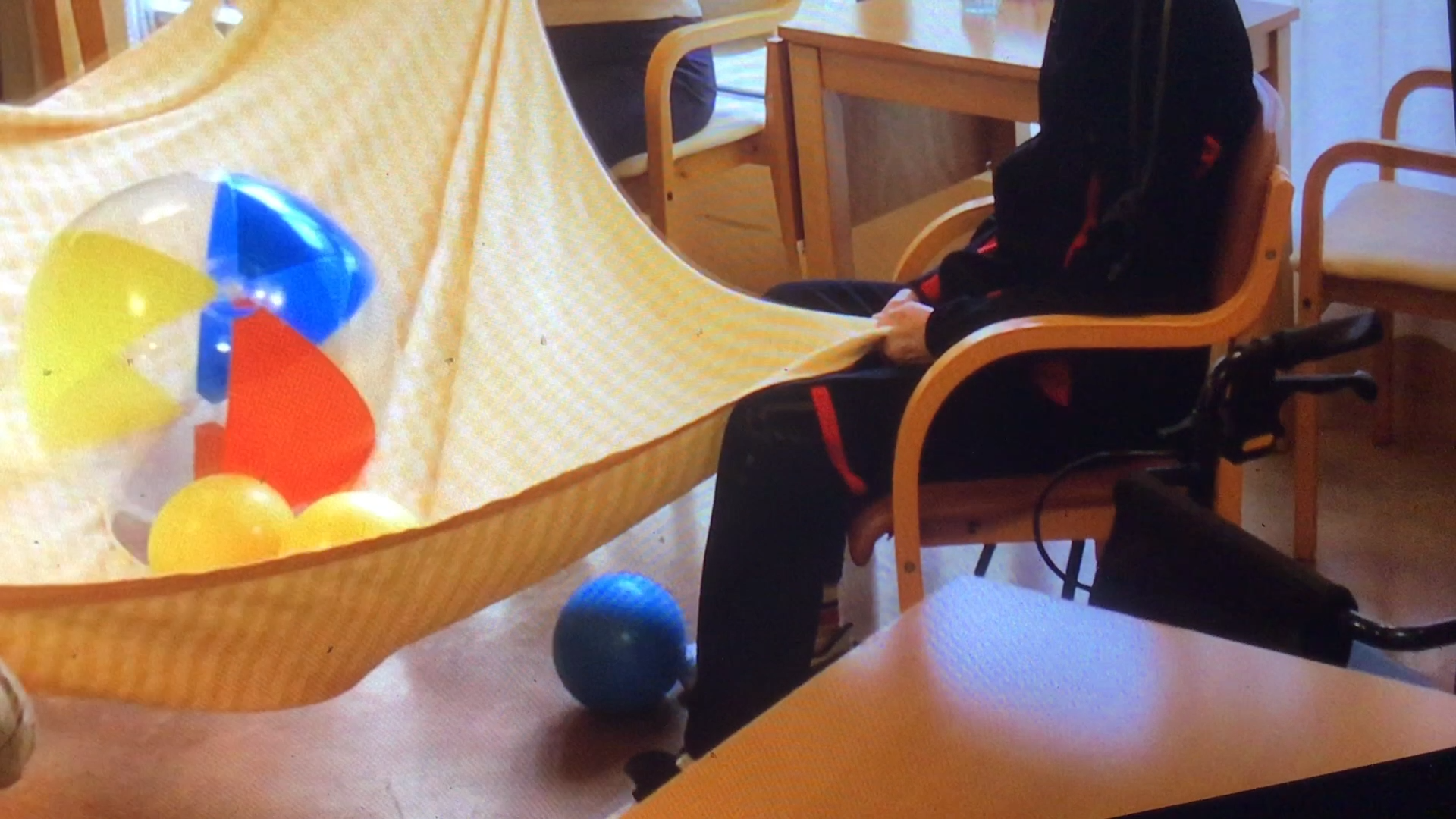 ビーチボールを穴から動かして小ボールを床に落としていきます。