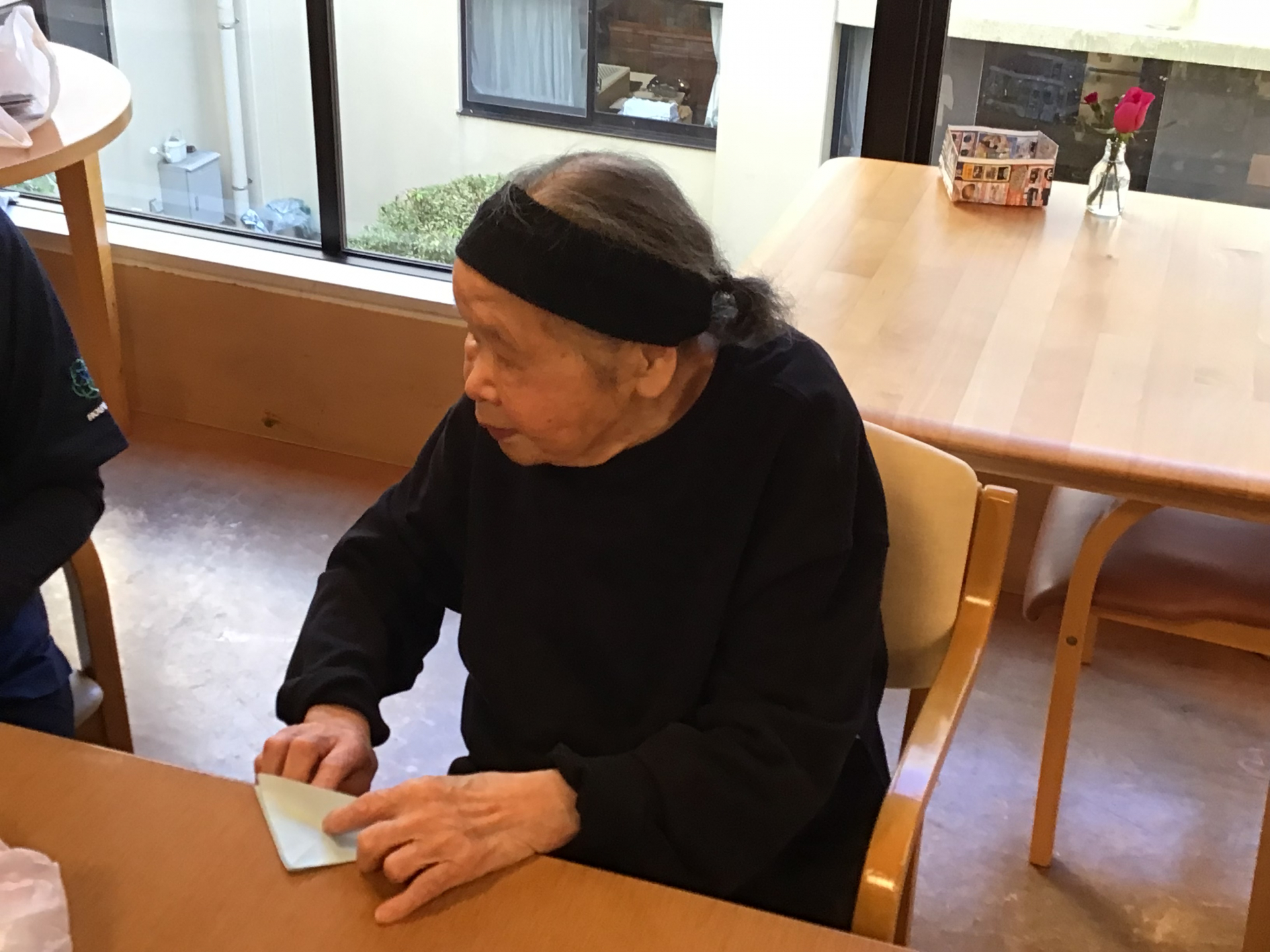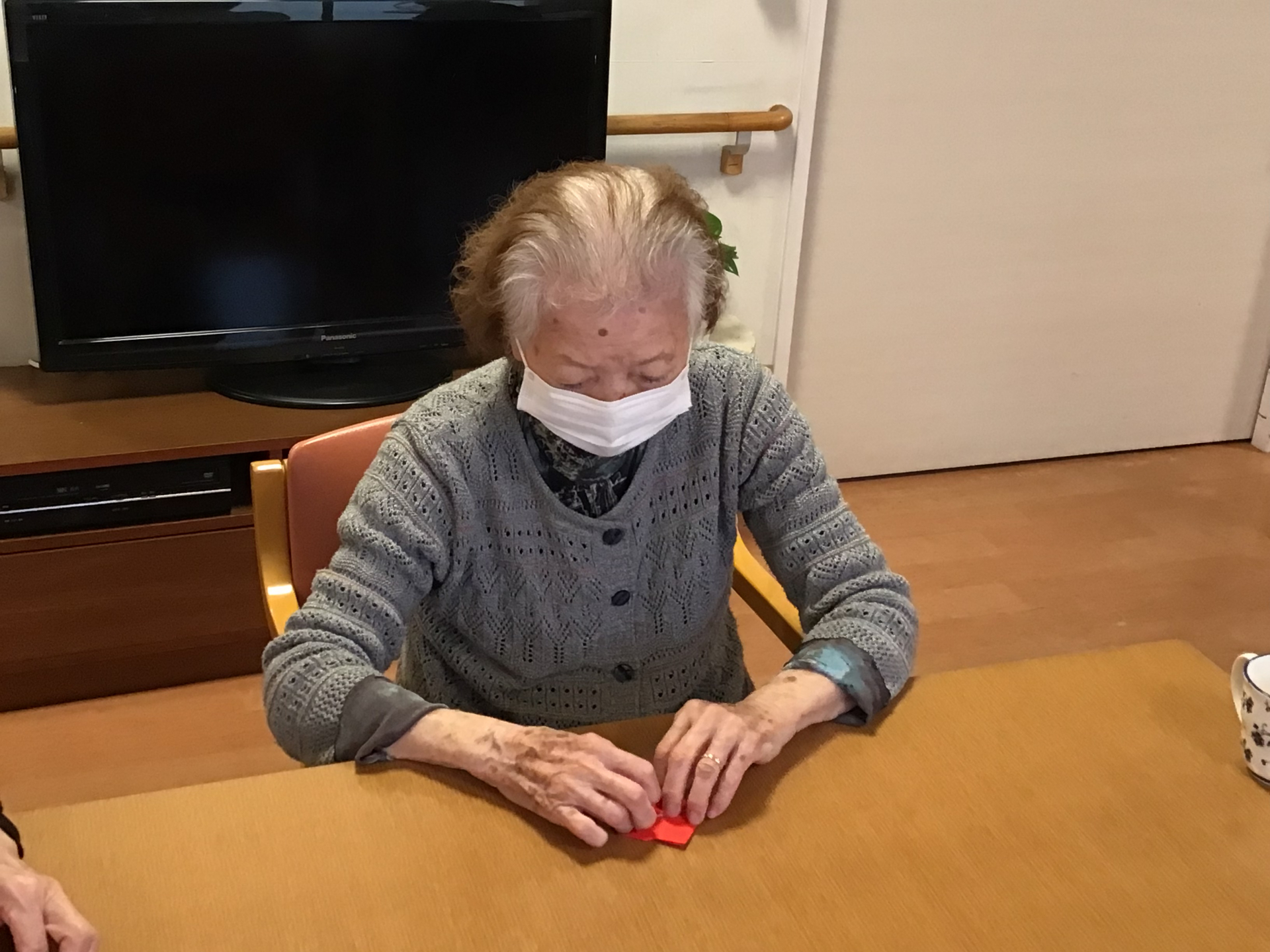皆さんと折り紙で風船を折りました。「昔よく折っていたけど忘れちゃったわ」と少し不安気な様子でしたが、折り始めるとあちらこちらで「あーそうそう」と言う声が聞こえてきました♪作った後はうちわを羽子板がわりにして羽付きをしました。皆さんの笑い声を聞いて癒されました╰(*´︶`*)╯♡
