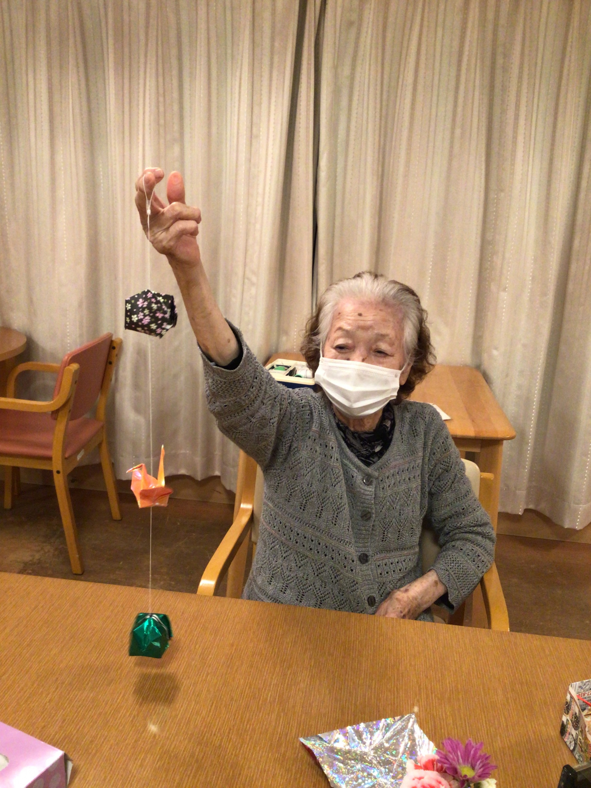 久しぶりに折り紙を皆さんで折りました。鶴を折リ始めると「昔はよく折っていたけど忘れちゃったわ」と言われながらも折っていくうちに思い出したかのように指先が自然と動いていました。最後は糸で吊るしてお部屋に飾りました♪ くすのきユニット D.M