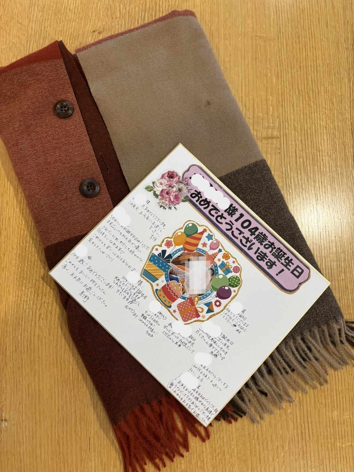 職員から寄せ書きメッセージと、ブランケットをプレゼントさせていただきました(^^♪