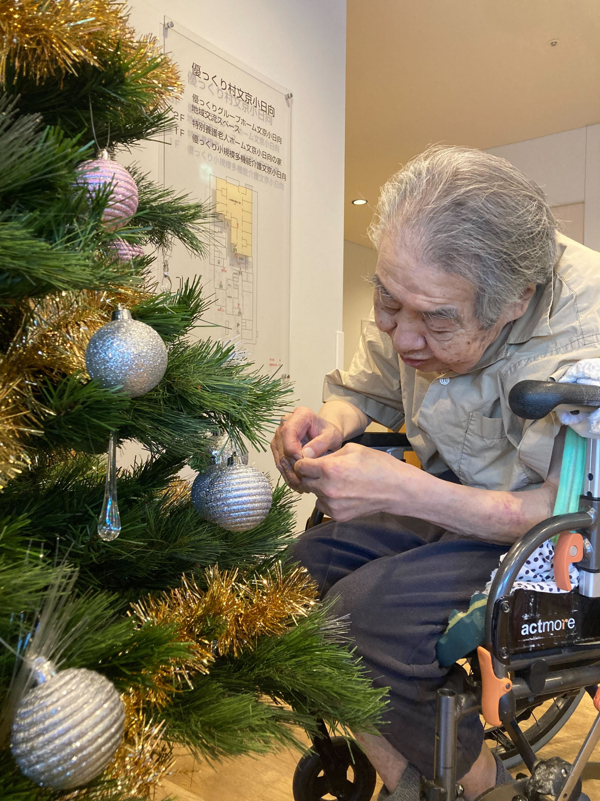 入居者の皆さまにもご参加いただき、キラキラしたオーナメントやベル、リボンなど、お好きな飾りを選んでひとつずつ丁寧にツリーへ飾っていただきました。