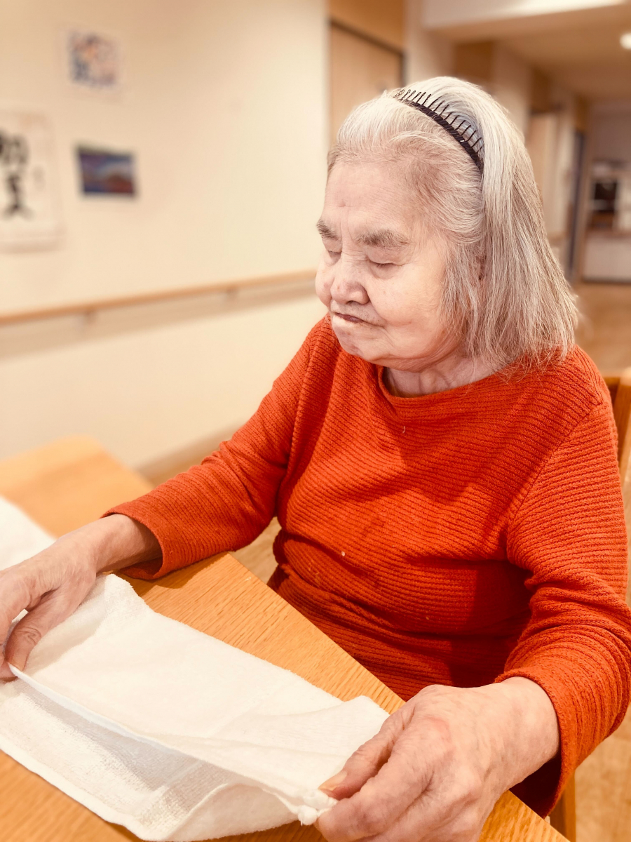 タオルたたみのお手伝いをお願いしたところ、快く引き受けてくださいました。