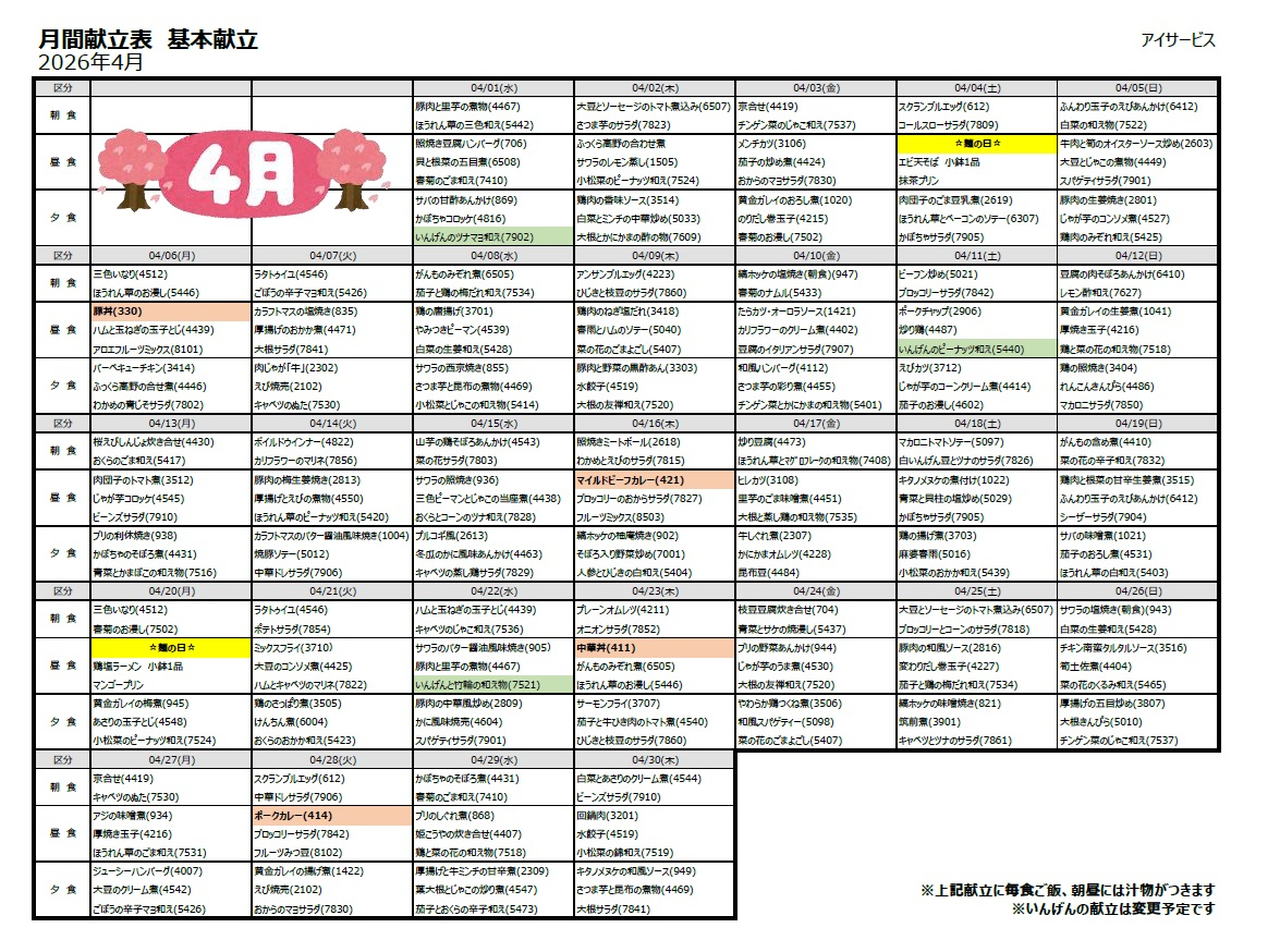 4月の献立を更新しました