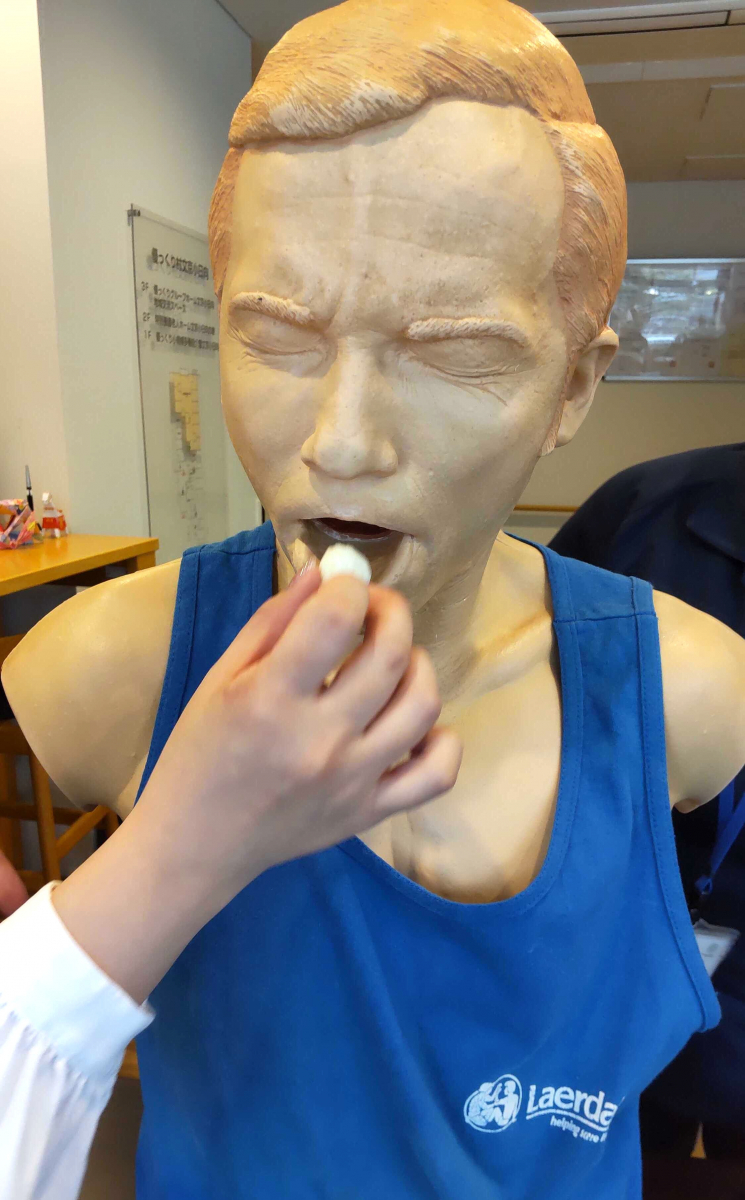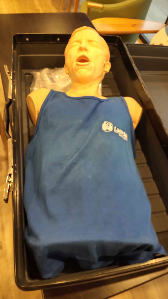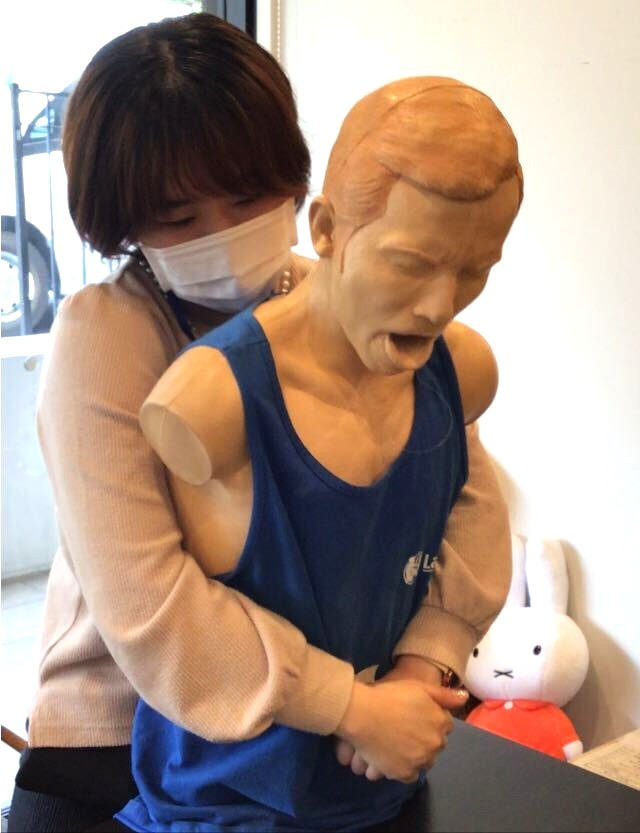 このチャーリー君にご協力いただき、施設内でハイムリック法の研修を行いました。
