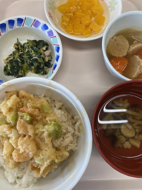 本日の昼食は、春らしい天ぷらの丼ぶりです