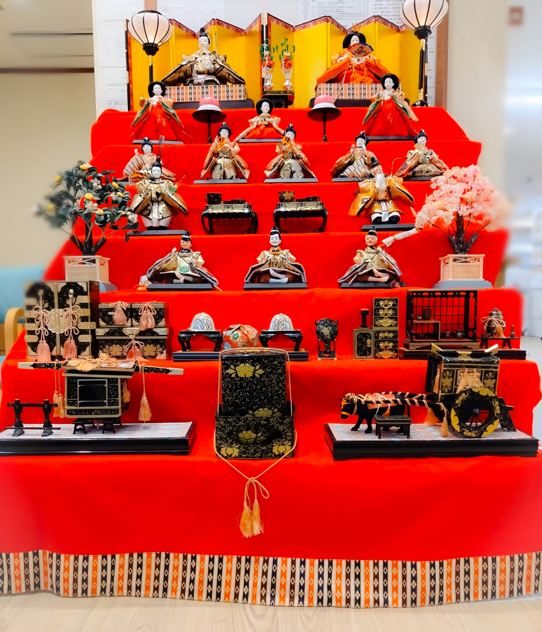 もうすぐひな祭りということで、一階の玄関に雛飾りが登場しました!